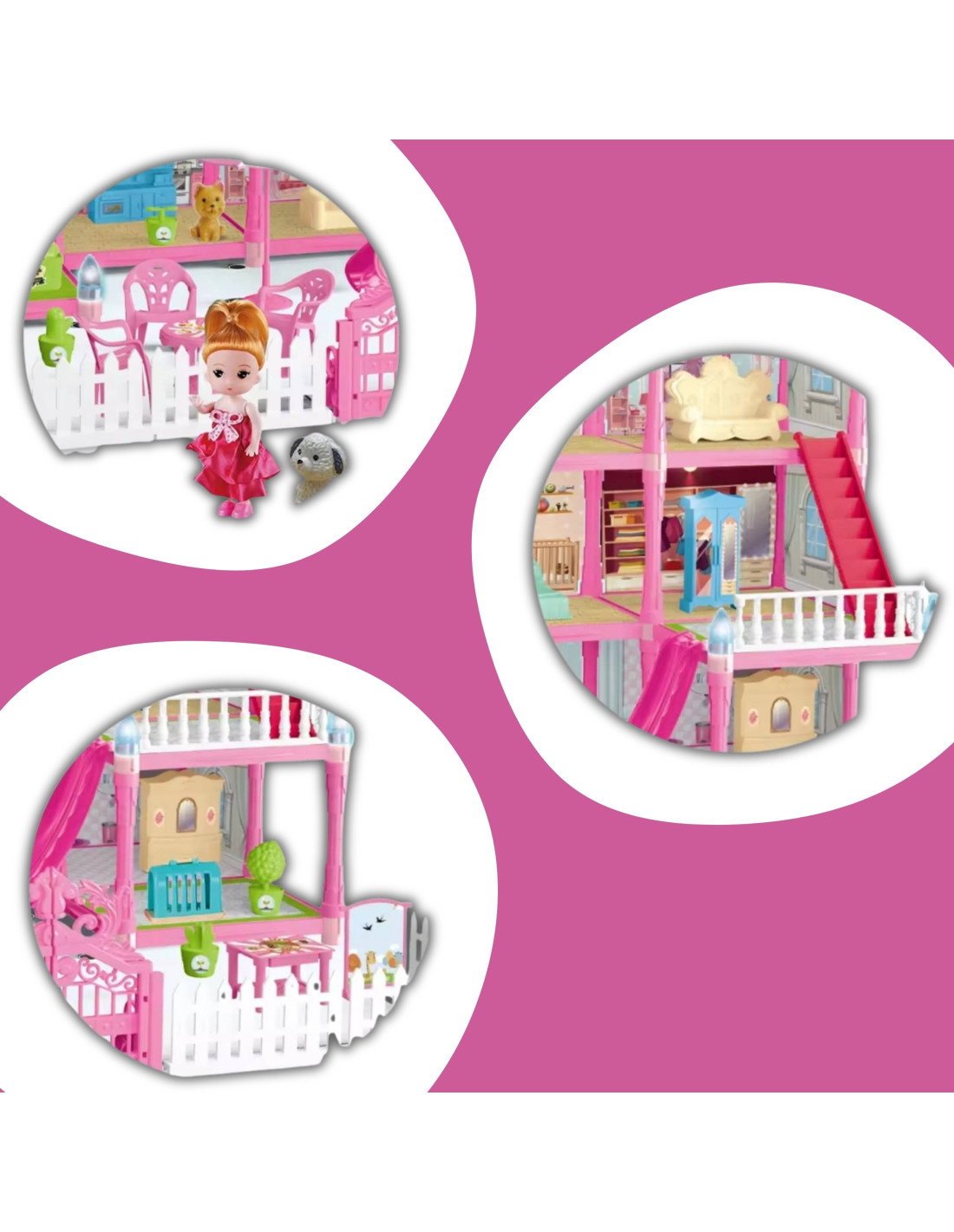 This beautiful, multi-level dollhouse from Woopie is the perfect toy that will provide your child with hours of wonderful, creative play . The set is richly equipped with furniture and accessories , allowing for realistic role-play and creating their own stories. The house features night lighting , which adds a magical touch and makes play even more engaging. It's a great way to develop imagination , creativity , and manual dexterity .