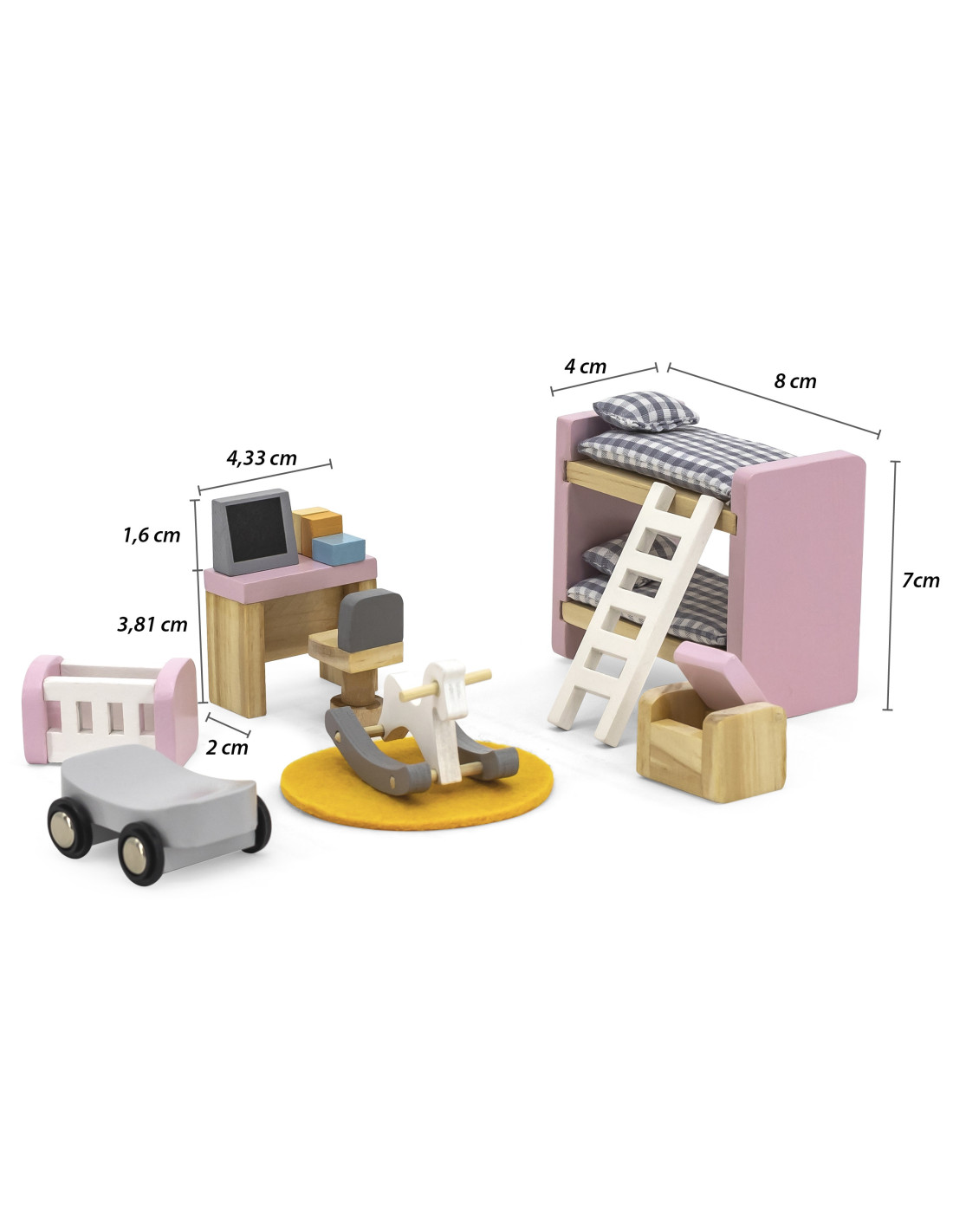 - - the set includes : a desk with a computer, a chair, a cradle, a bunk bed with a ladder, a rug, a ride-on toy, a rocking horse and a pouffe,