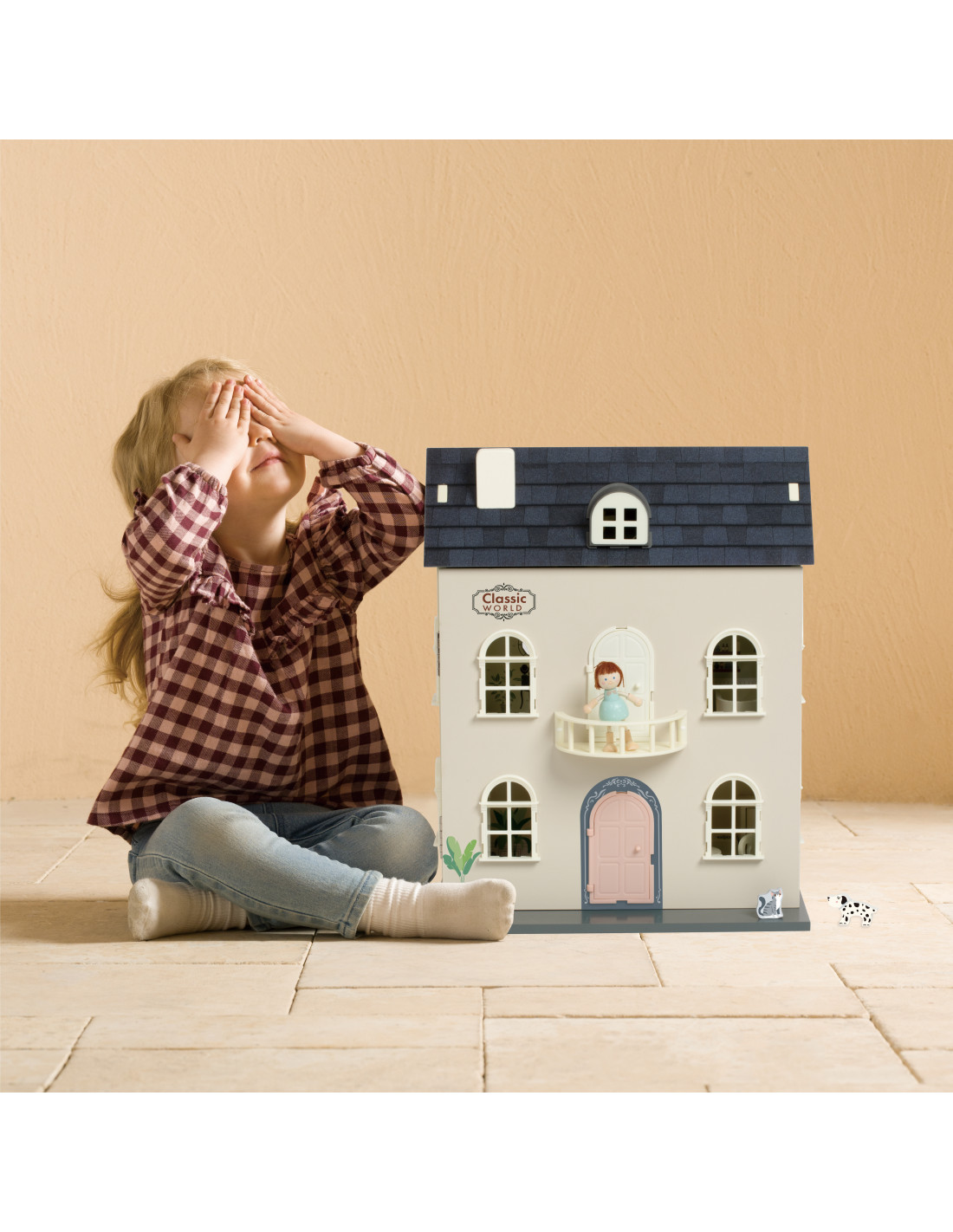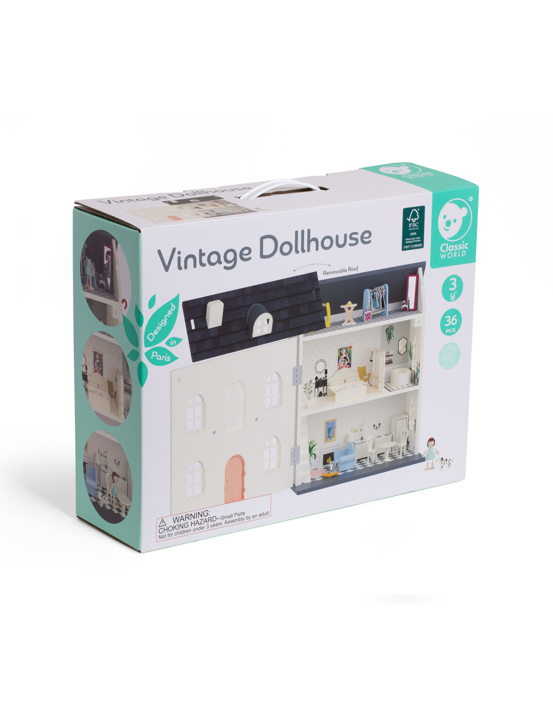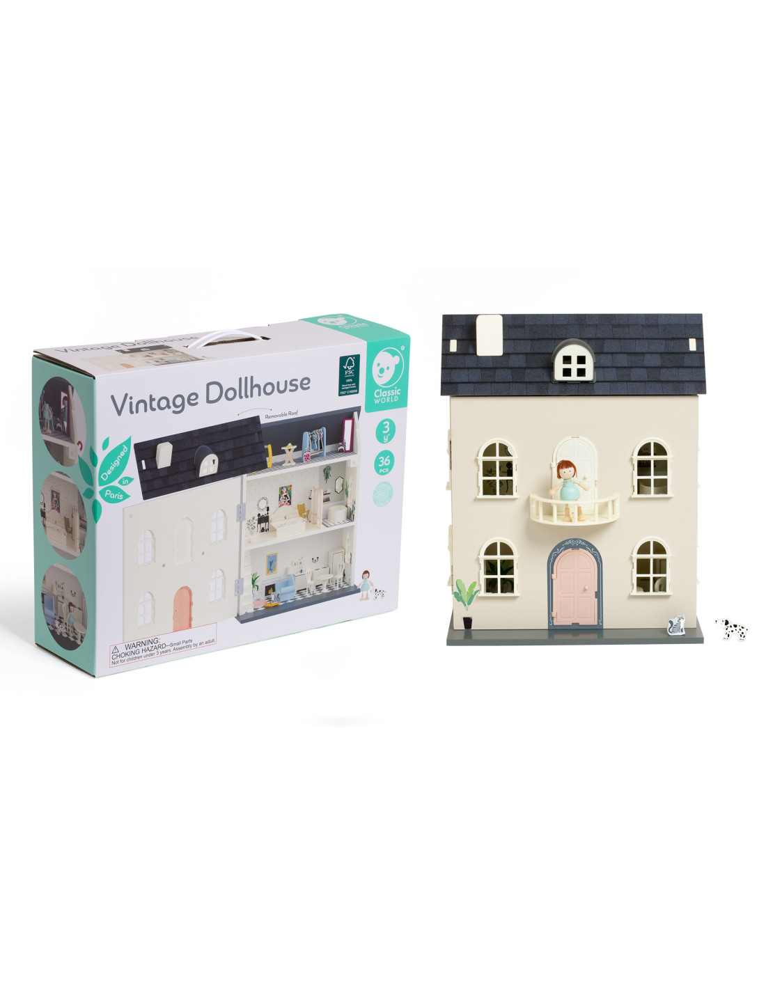 A charming vintage-style dollhouse from CLASSIC WORLD that will delight every child! This fantastic three-story dollhouse is beautifully decorated with a variety of furniture. The house opens through the roof, providing easier access to various rooms. Accessories for decorating the interior include a bed with a throw, a bathtub, a sofa, a lamp, a table, two chairs, a kitchen, and a refrigerator.