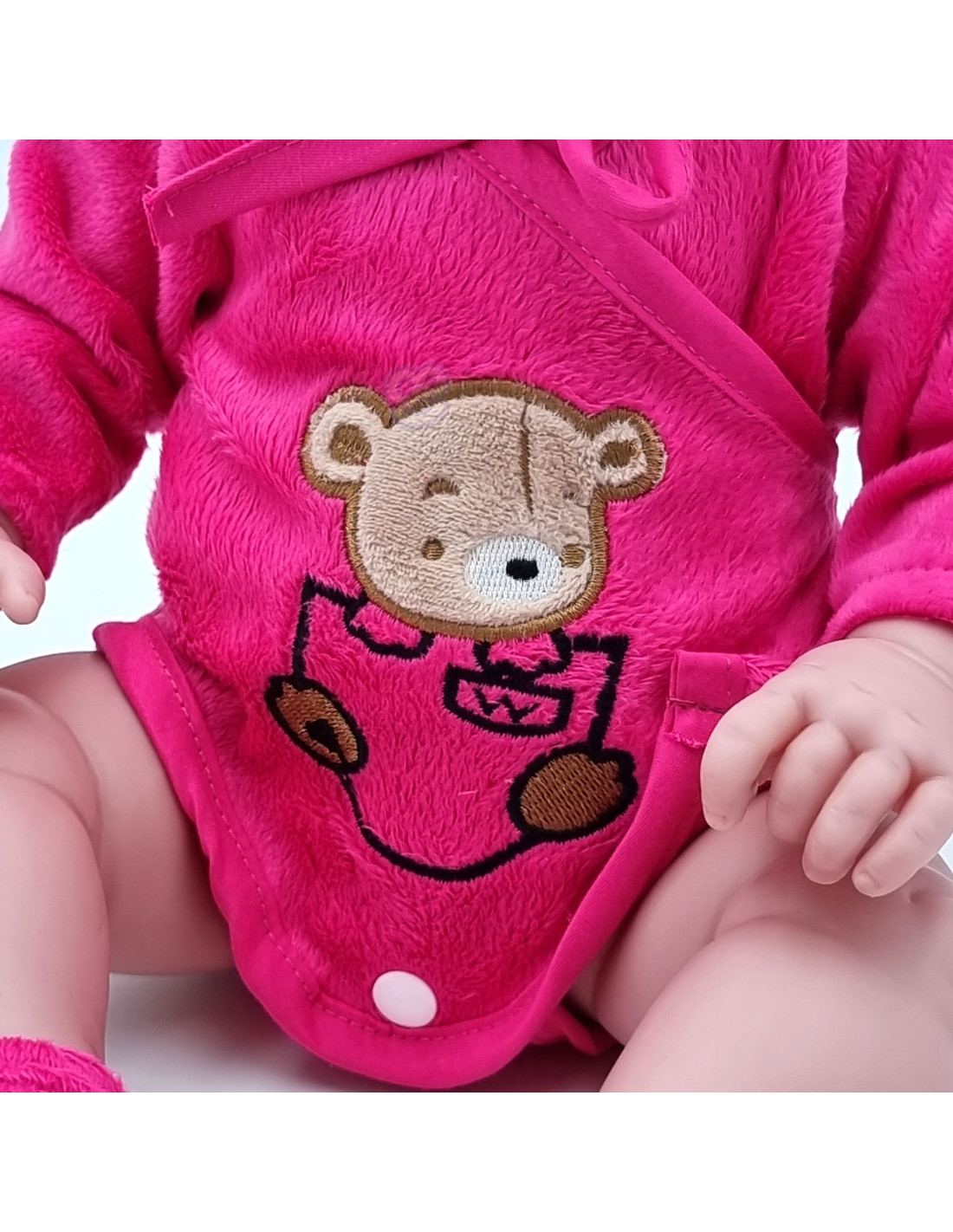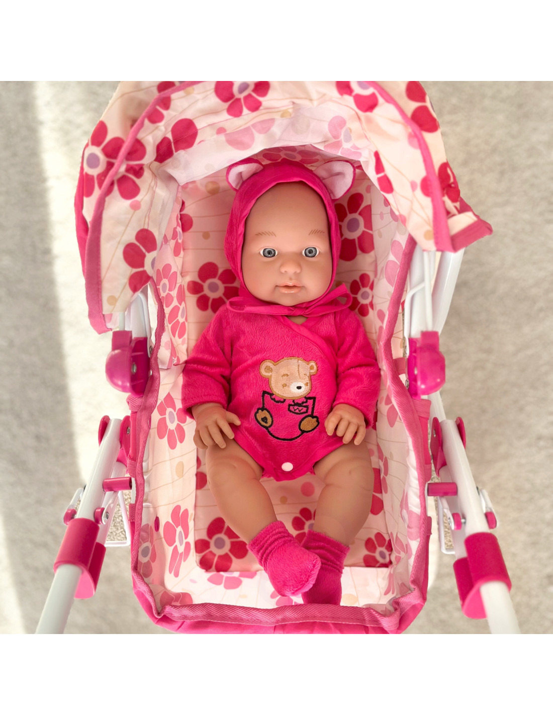 This Woopie baby doll will make every child fall in love! The baby is 46 cm tall and comes dressed in a bodysuit with a hood and booties . The doll has movable limbs, allowing it to be placed in a sitting or standing position. Playing with the doll helps children develop a sense of empathy and responsibility . This adorable little doll needs lots of care and love . The toy is made with great care , faithfully reproducing the appearance of a real baby, meticulously crafted down to the smallest detail, and the material is incredibly soft to the touch!
