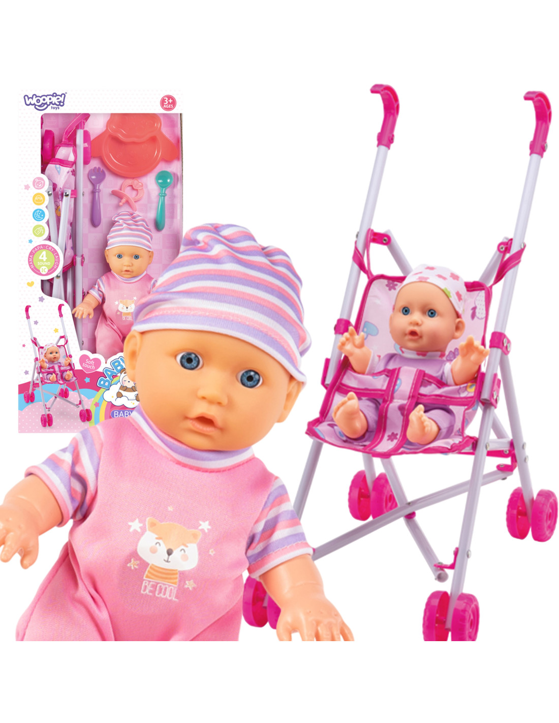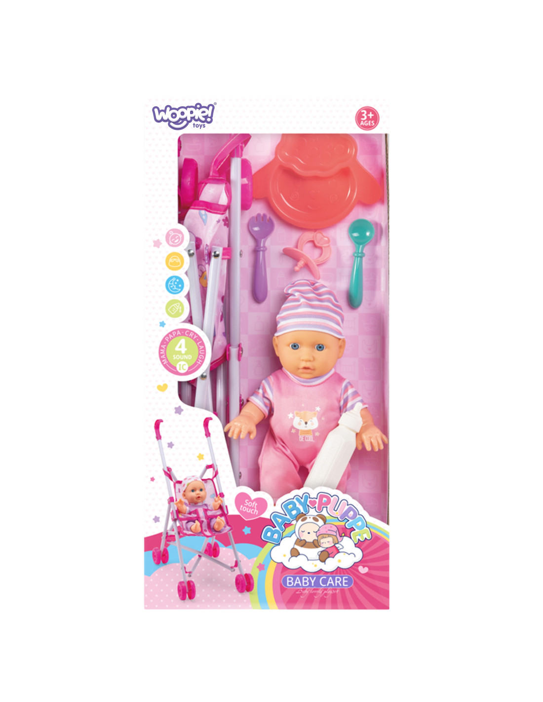 The Baby Doll with Stroller and Feeding Set from WOOPIE is the perfect first doll for children who want to imitate adult behaviors when caring for children. The doll makes sounds like mom, dad, crying, and laughing, adding even more realism to the play experience. The child can feed her or take her for walks thanks to the included stroller.