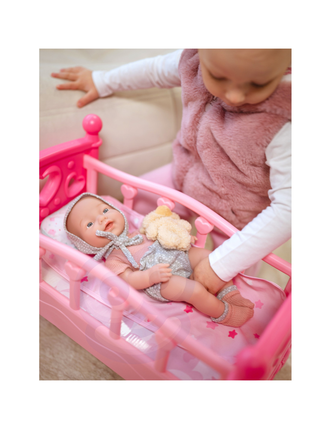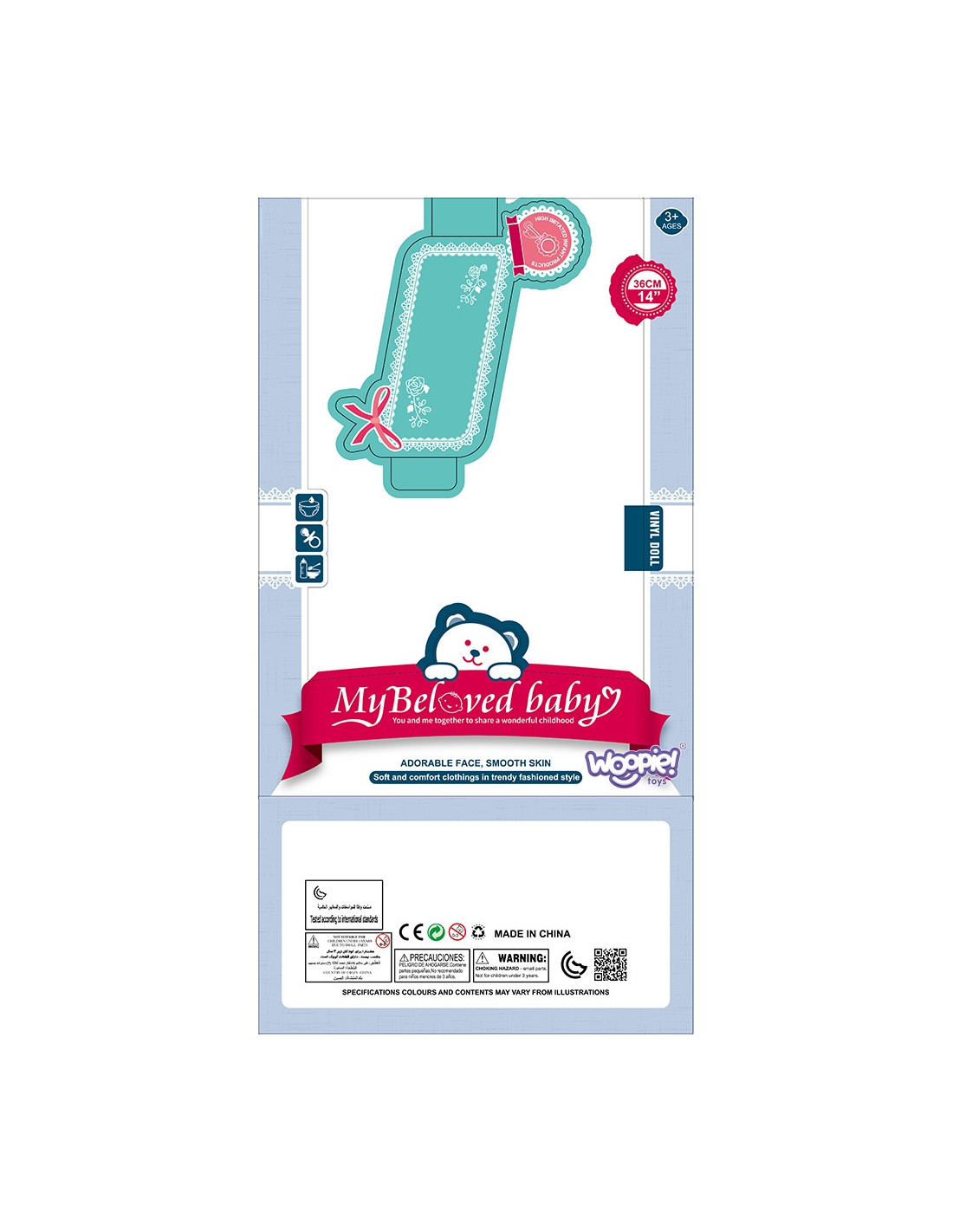My Beloved Baby Doll from WOOPIE ROYAL is a high-quality, carefully crafted product that your child will surely love . The doll comes dressed in a lovely outfit, matching socks, and a hat. The set also includes an adorable teddy bear that the doll can hold, alternating with a bottle. The baby has movable limbs , and the included pacifier can be placed in its mouth .