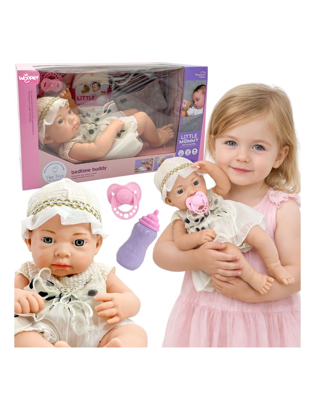 Give your child a special friend to play with and learn about caring from the Woopie brand – the Little Mommy doll . Her realistic appearance makes your little one feel like a real mom or dad. The doll wears a charming white dress and hat , and the set includes accessories needed for everyday care. She helps your child develop their imagination, learn empathy , and responsibility. It's a perfect gift that will provide hours of creative play!