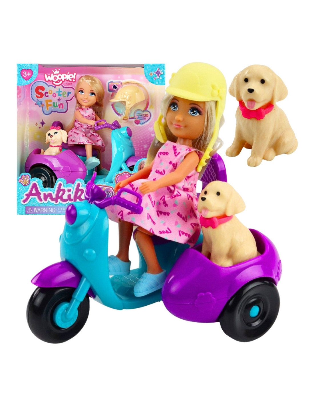Discover a world of fun with Ankiki doll and her adorable dog from WOOPIE! This colorful doll, complete with scooter and trailer, will provide hours of imaginative play. She has beautiful blonde hair and a charming pink outfit that catches the eye. Perfect for children aged 3 and up, this set is safe and easy to use. This set will transport your child to a world of mini adventures and joy!