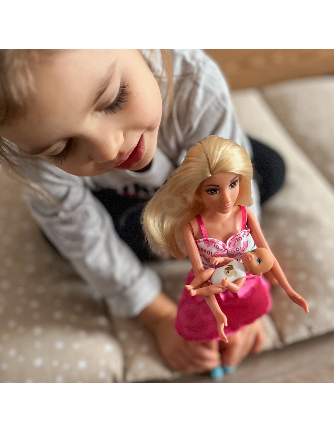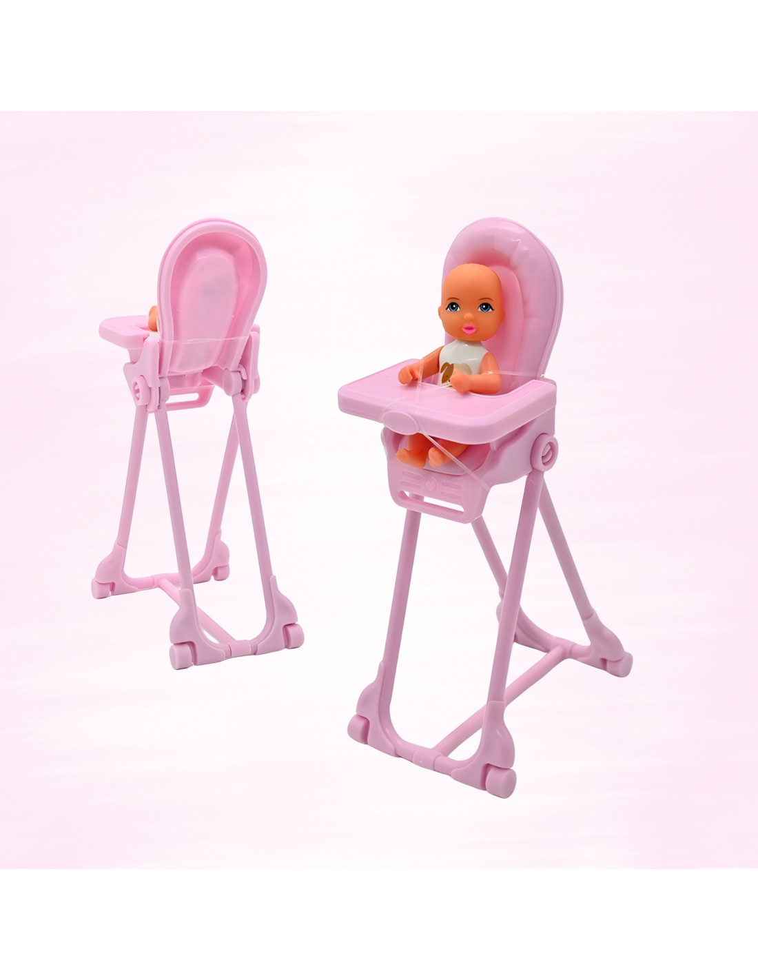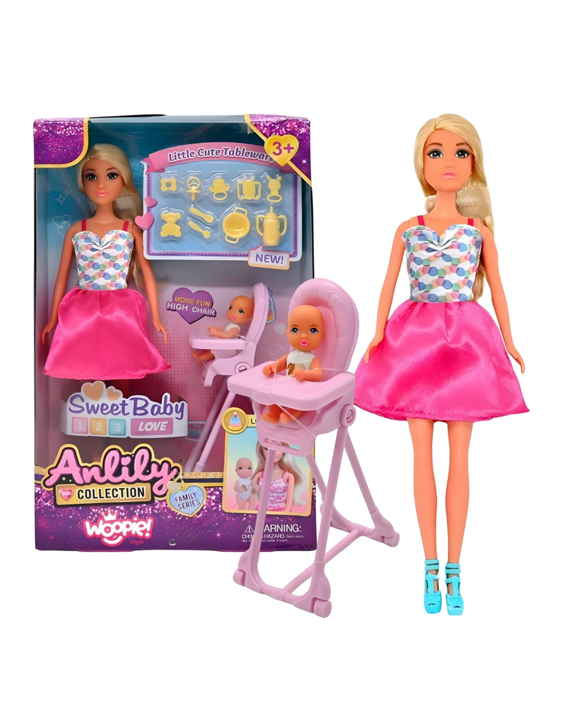 The Lily doll with baby from Woopie is a unique set for role-playing family scenes and everyday childcare. Realistic details, accessories, and features make play even more engaging and educational. The doll wears a colorful, stylish dress and has long, brushed hair that can be styled into a variety of hairstyles. The baby is an adorable little one waiting to be fed in a high chair —the same kind you'd find in real homes. Children can use the included accessories: plates, bottles, jugs, and cutlery —to "feed" the baby, caring for him like a real mother. This toy not only helps children spend time creatively but also develop emotions , imagination , and manual skills . It's a great tool for role-playing, allowing young children to understand interpersonal relationships and everyday responsibilities in a warm, homely atmosphere.