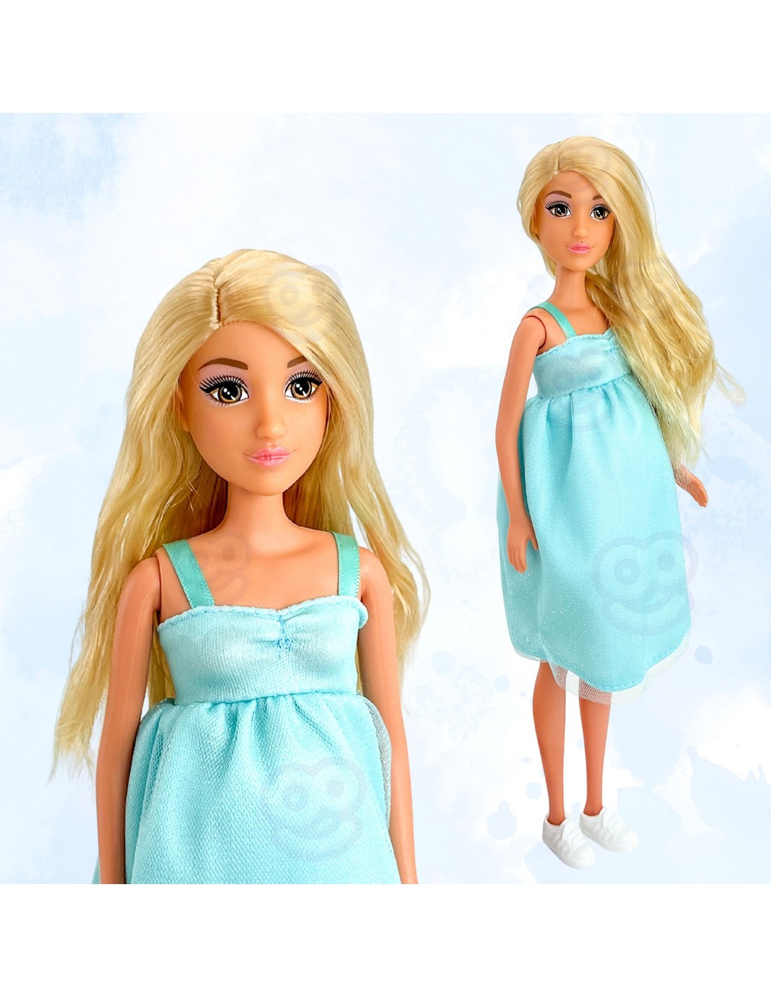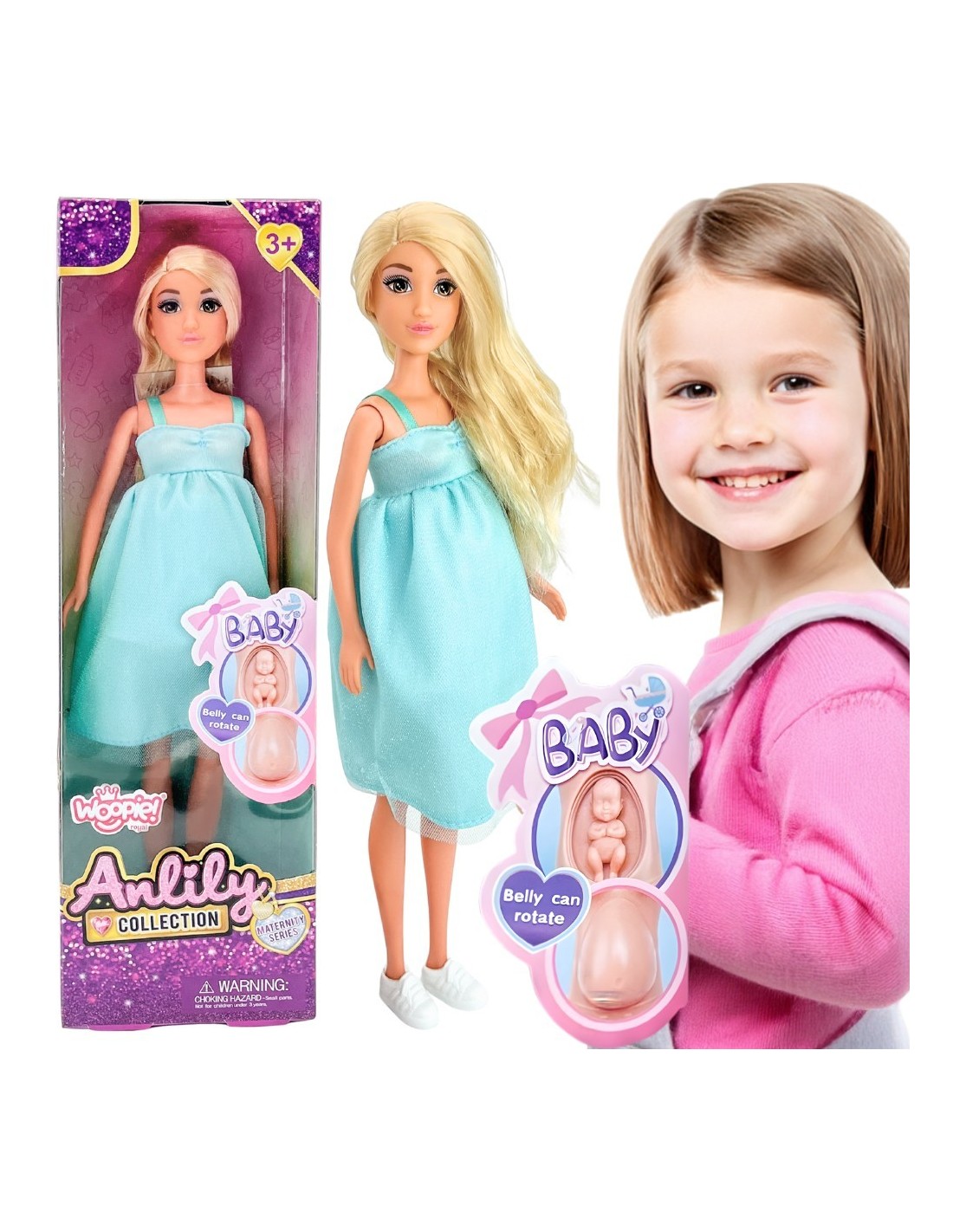 This doll representing a mother-to-be from the Woopie brand is a unique option for children interested in family, motherhood, and caring for little ones. This unique doll was designed to realistically recreate pregnancy and birth . Its greatest feature is a rotating belly from which the baby can be removed – a feature that allows children to simulate labor scenes, caring for the baby, and family moments right after birth. The doll is dressed in a delicate blue dress , giving her an elegant look. Her blond hair and delicate facial features make her easily endearing to children and make her a favorite playmate. Thanks to the simple mechanism for removing the baby, the toy is easy to use, even for younger children . This doll is not only a source of great fun but also a tool for supporting a child's emotional development . It teaches empathy and understanding the role of a mother, and also facilitates conversations about birth, family bonds, and love. It is perfect for both independent play and playing with peers or parents.