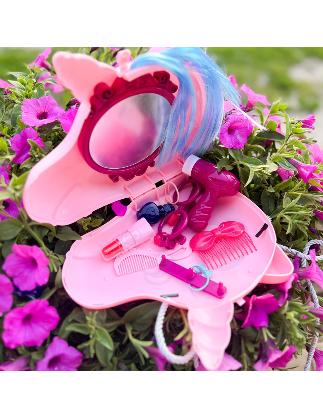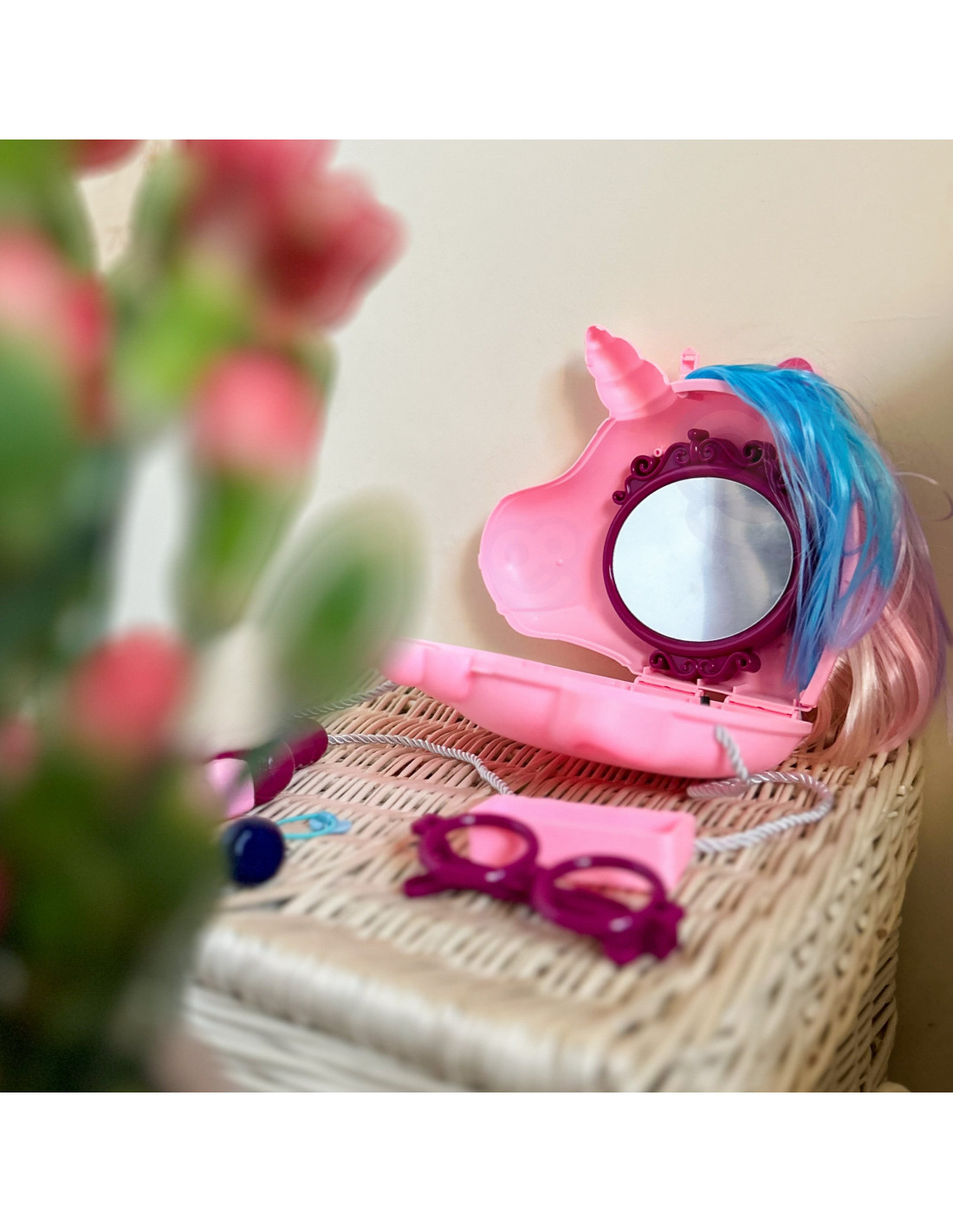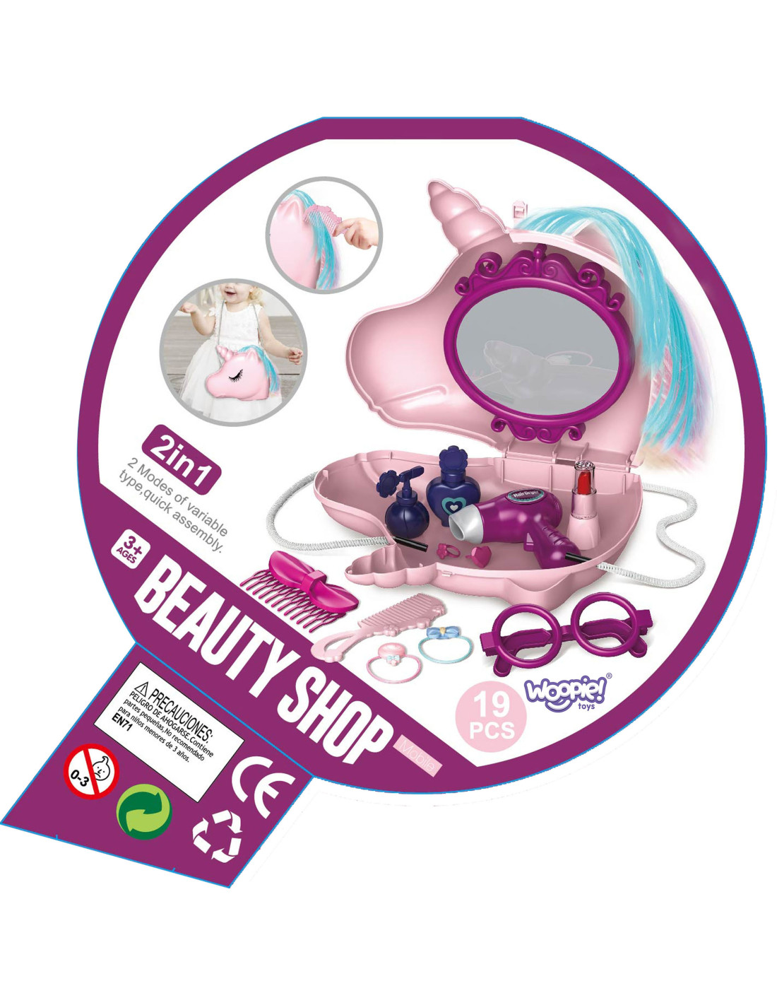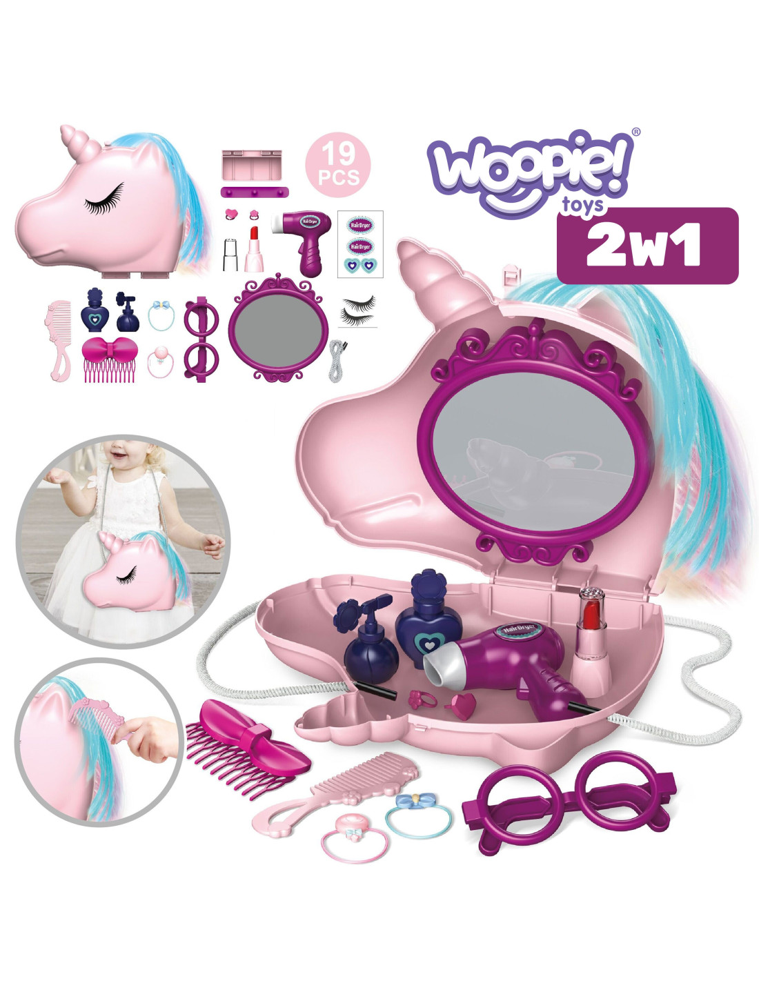 The 2-in-1 Beauty Salon in a Bag Dressing Table for Girls by WOOPIE is the perfect choice for all little princesses . This set will make your child feel like a real princess and has everything they need to get ready for a big ball or a night out with friends. In addition to accessories like a mirror , comb , and glasses , the set also includes a hairdryer . The cosmetics and other accessories perfectly replicate real-life objects, allowing them to become a little princess!