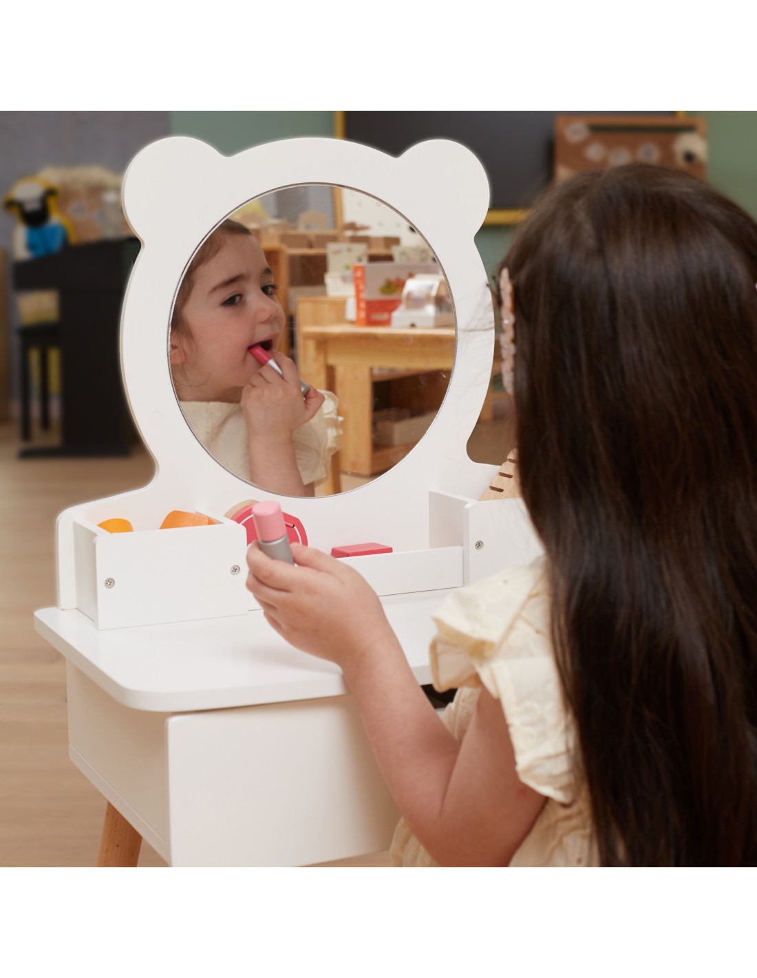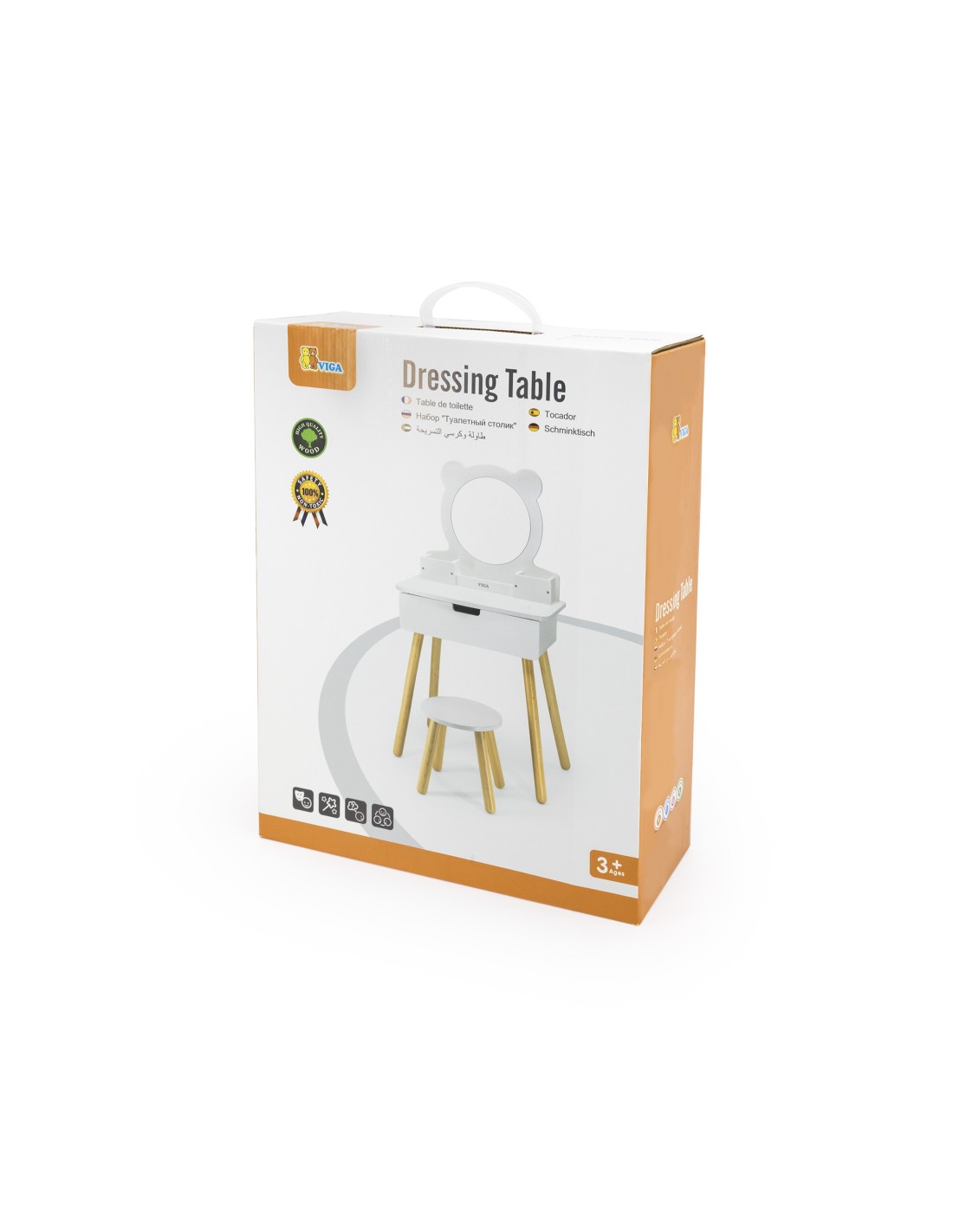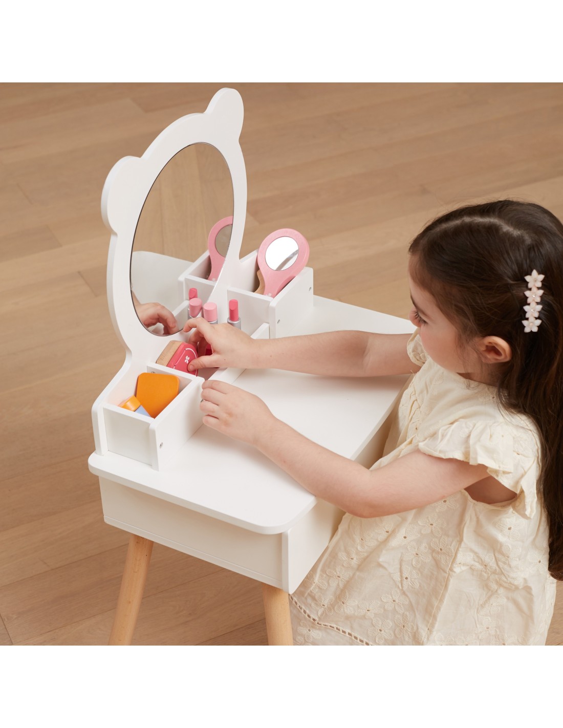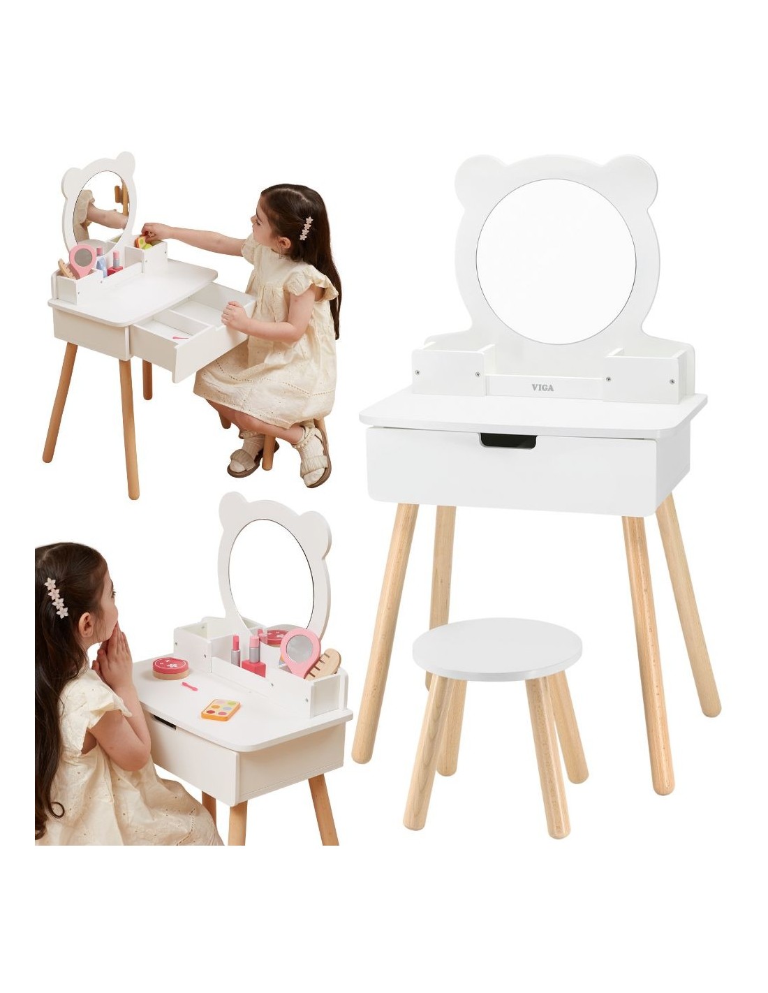 This large, freestanding white dressing table from Viga is a dream piece in every girl's room. It features a pull-out drawer where your little princess can store her treasures. Below the mirror are compartments for handy accessories. The set also includes a dressing table chair. The entire piece is made of wood and painted with non-toxic paints that are safe for children and the environment.