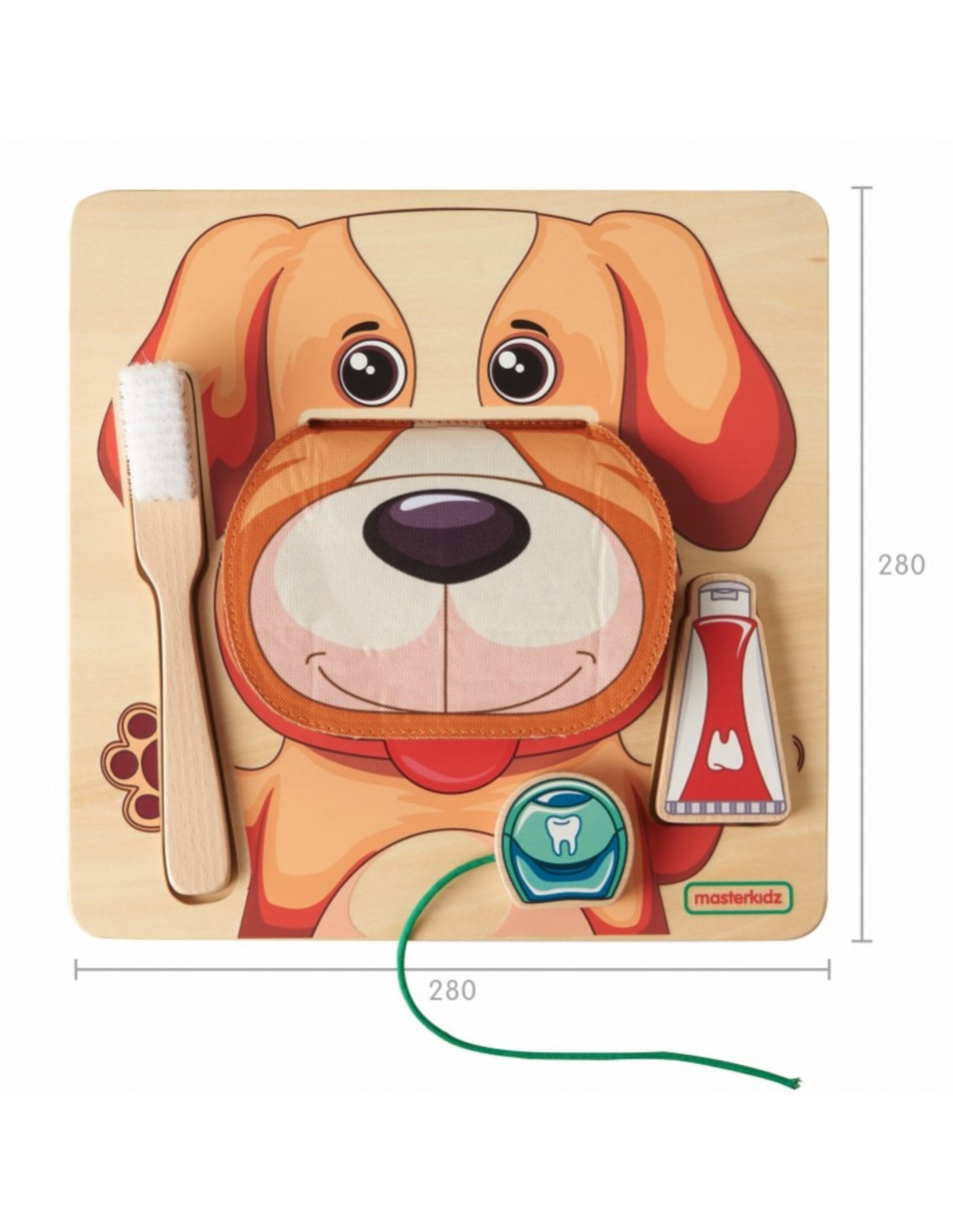 This educational board combines the fun of brushing a dog's teeth with learning about oral hygiene. It features a friendly dog with a mouth that opens to reveal 10 teeth . The set includes a toy toothpaste , brush, and floss. Children can playfully brush their dog's teeth by squeezing the toothpaste onto the brush, scrubbing, and flossing, which develops their fine motor skills and precision. The toy encourages conversations about caring for their own teeth and allows for individual or paired play.