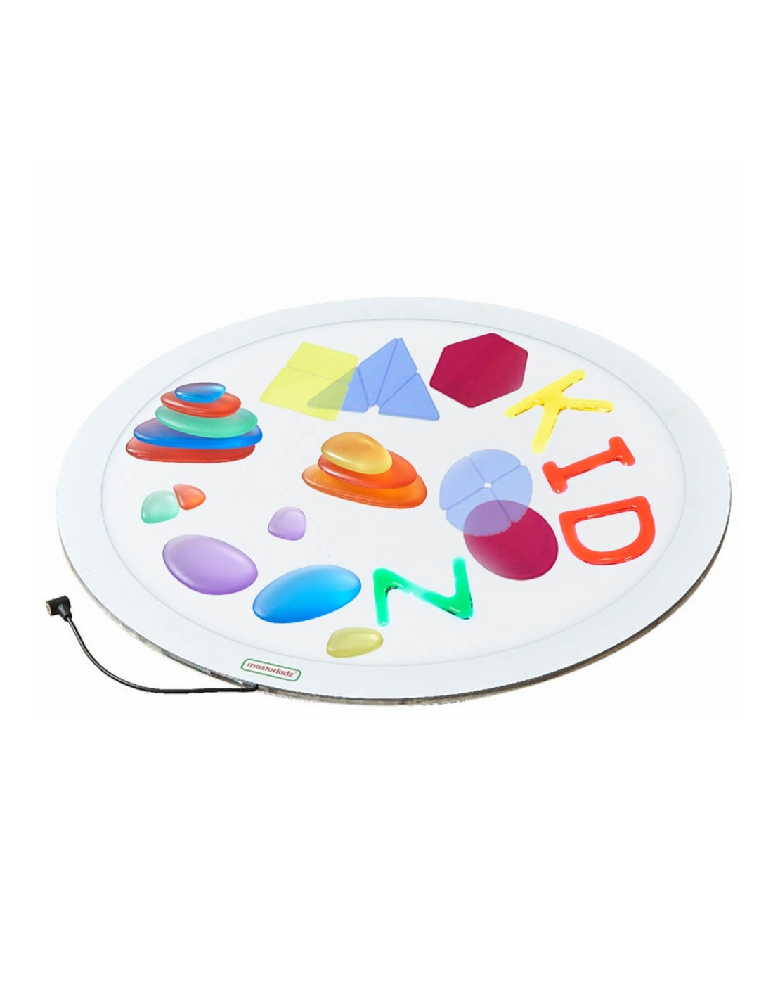 The circular light panel is a versatile educational tool that's perfect for any classroom. Its lightweight design and large diameter make it easy to transport and provide adequate space for observation and play for children of all ages. The panel emits colorful light, freely configurable thanks to the included remote control. Users can set the panel to one of 11 pre-programmed colors or manually change the emitted color based on the primary colors of light: red, green, and blue. The device also allows for smooth color transitions and the ability to save selected colors for future use. The panel can be placed on either a table or the floor – its size allows for simultaneous work by one child or a group. The panel works perfectly with the included colorful accessories, which expand the play and learning possibilities, allowing for the creation of diverse patterns and light compositions.