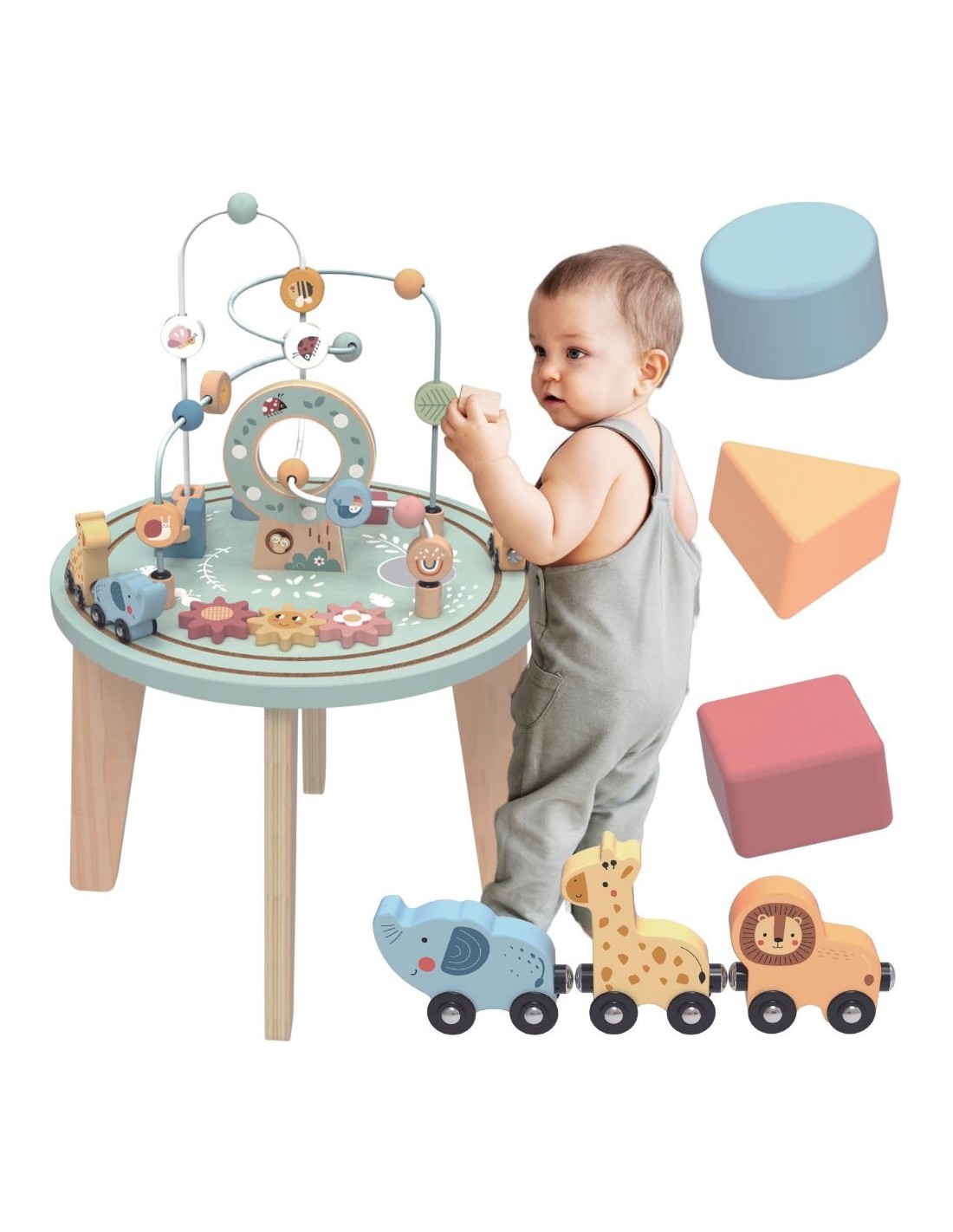 The Wooden Activity Table from TOOKY TOY can capture a child's attention for longer thanks to the variety of activities offered. This toy promotes standing and supports the development of fine motor skills, coordination, logical thinking, and creativity. Among the various attractions on this table are a motor loop, a sorter, gears, and a train . Various activities will introduce young children to the world of shapes, colors, and play. The cheerful and diverse colors attract attention. The toy is made of wood, in a child-safe manner, using non-toxic paints.