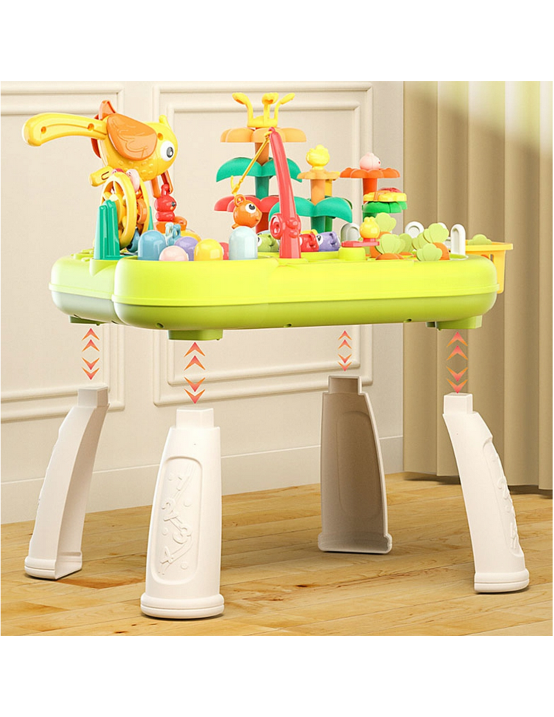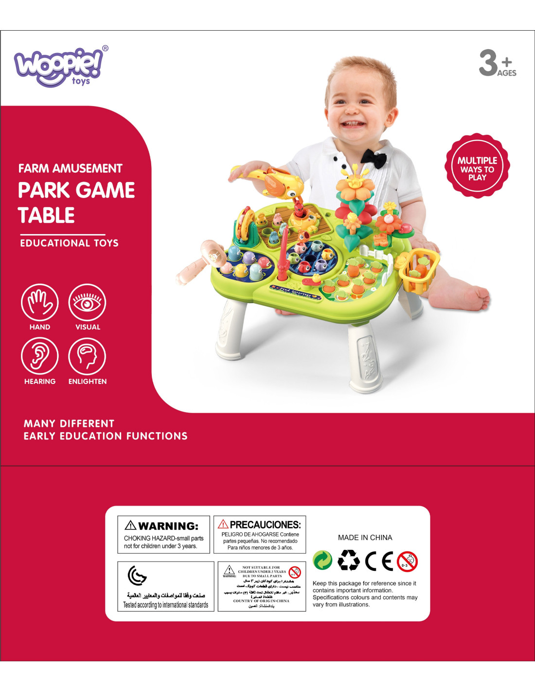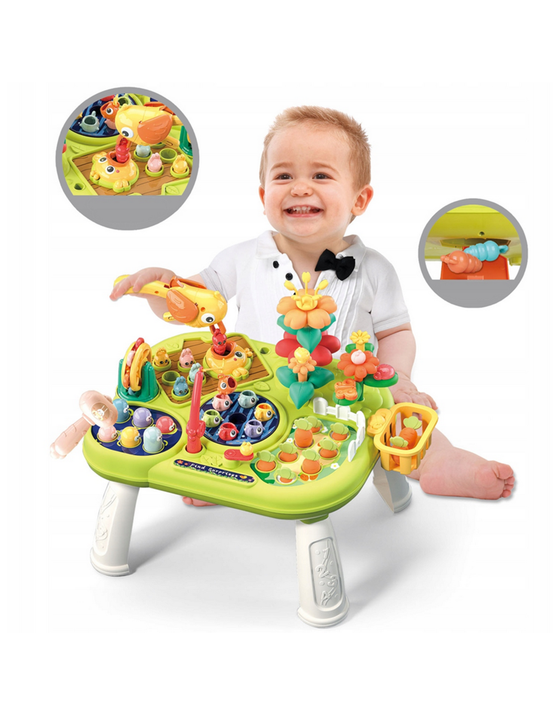 The interactive multi-table educational set from WOOPIE is a unique set of games and toys that not only provides entertainment but also develops your child's skills. Thanks to its multi-functionality, the table allows for a variety of play options and guarantees that the toy won't get bored, as it offers a wide range of activities: fishing , hammering bugs , playing in the garden , or playing with a woodpecker to pull out a bug. All these activities allow your child to calmly become familiar with the tasks assigned to them, teach patience , and improve their manual skills . While playing, children relax and develop their fine motor skills . The toy provides interactive and engaging play that develops their imagination, observation skills, and interpersonal skills, allowing them to explore the world around them .