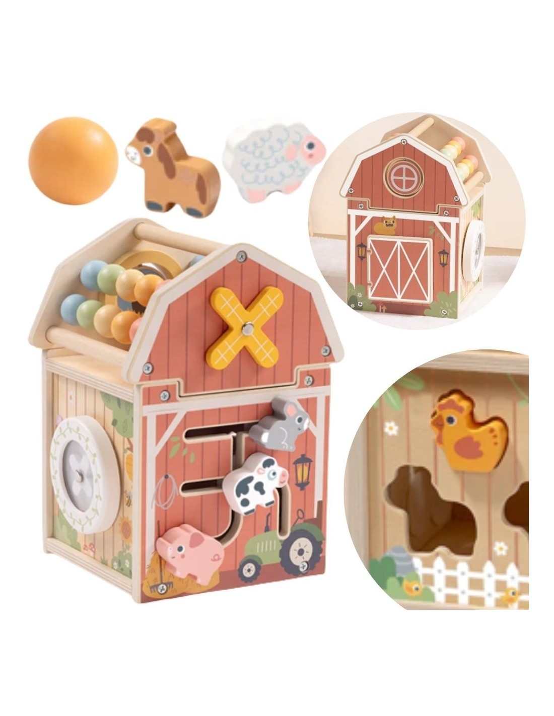 The Wooden Activity Barn from Tooky Toy is a wooden barn-shaped sorter that holds plenty of surprises! This charming wooden barn-shaped sorter is perfect for the youngest explorers. Featuring opening doors, moving parts, a colorful abacus on the roof, and adorable animal figures, each side of the toy is a new adventure that engages your child and encourages active play. Thanks to its clever design that combines a variety of activities, this wooden barn provides hours of valuable entertainment that supports your little one's development on many levels.