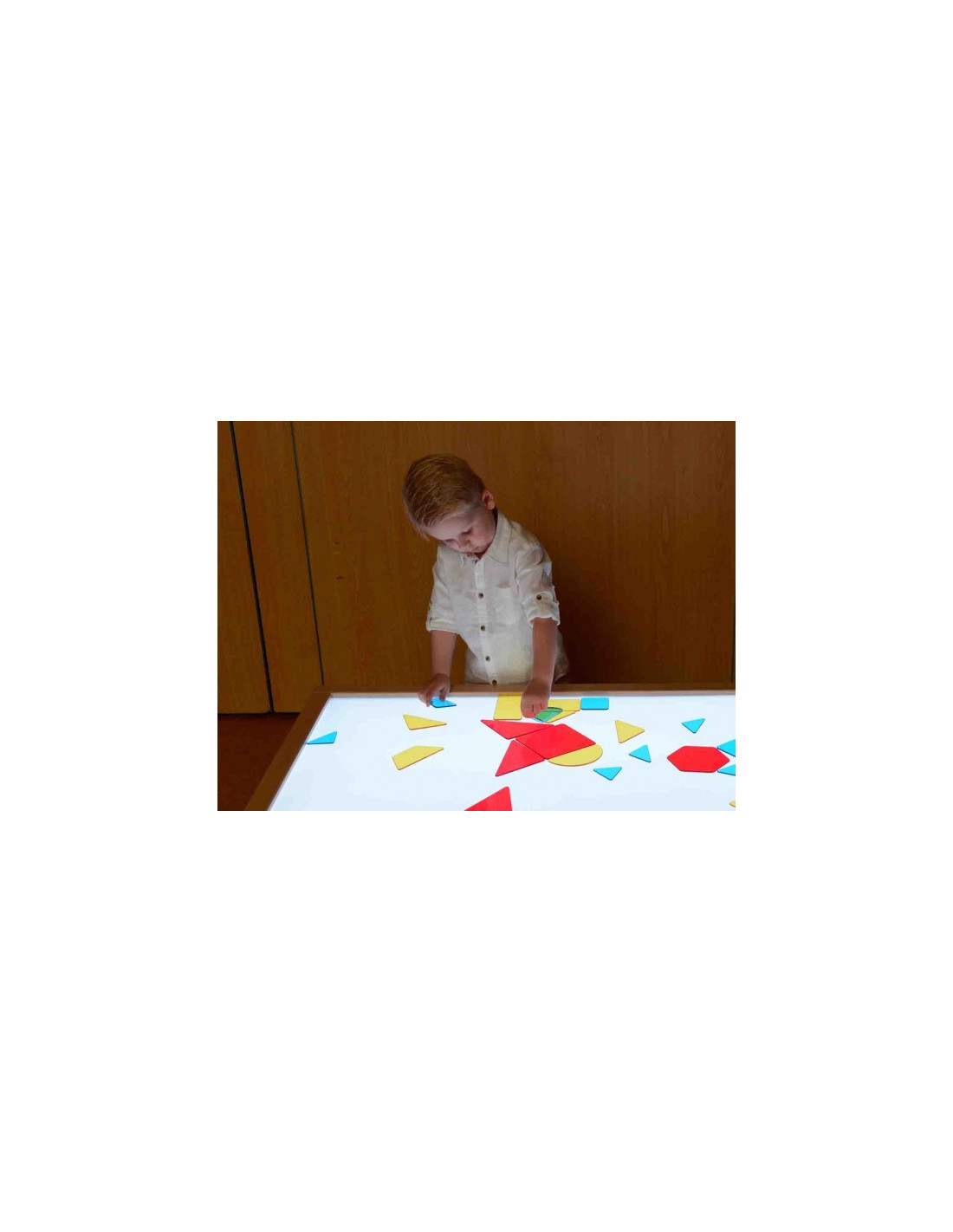 A set of translucent, colorful tiles in various shapes makes teaching geometric shape composition simple and easy. The pieces are made of durable acrylic in precise colors, so children can also learn about color mixing , for example, red + yellow = orange. They pair perfectly with the Masterkidz Education LED light panel set. The set comes in a sturdy wooden box for easy storage.
