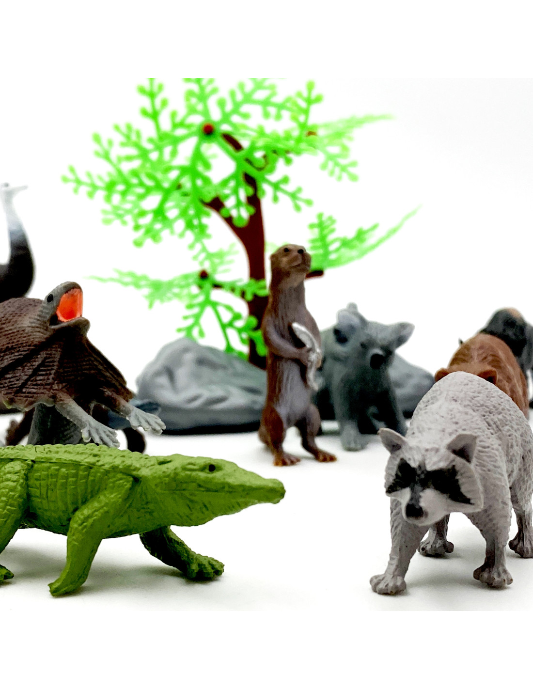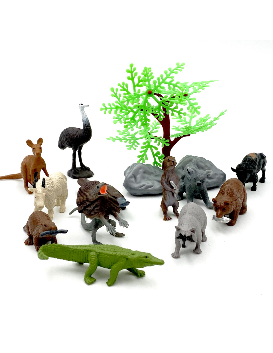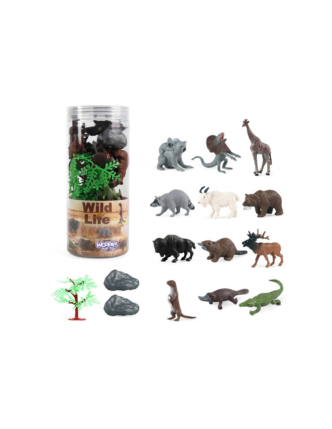 The Figure K set from WOOPIE is the perfect set for any animal fan. The set includes 12 wild animals , a tree, and two rocks . These realistic-looking figures will enhance a young collector's collection, serve as an educational tool , and provide fun that will expand the scope of your child's imagination and creativity.
