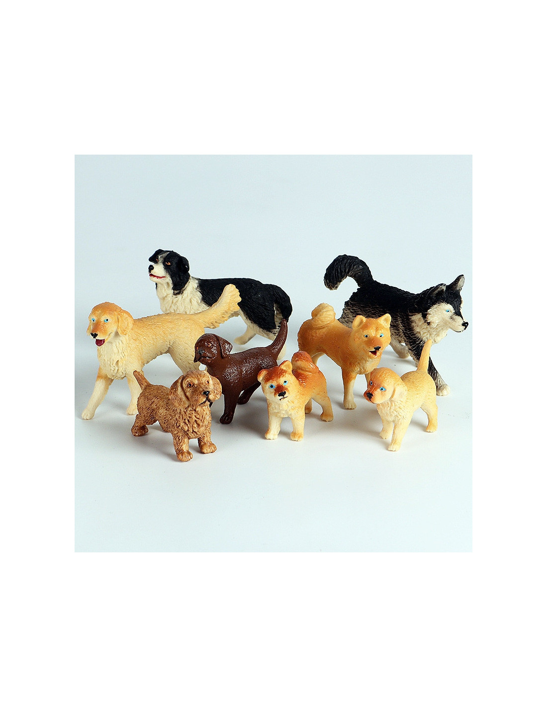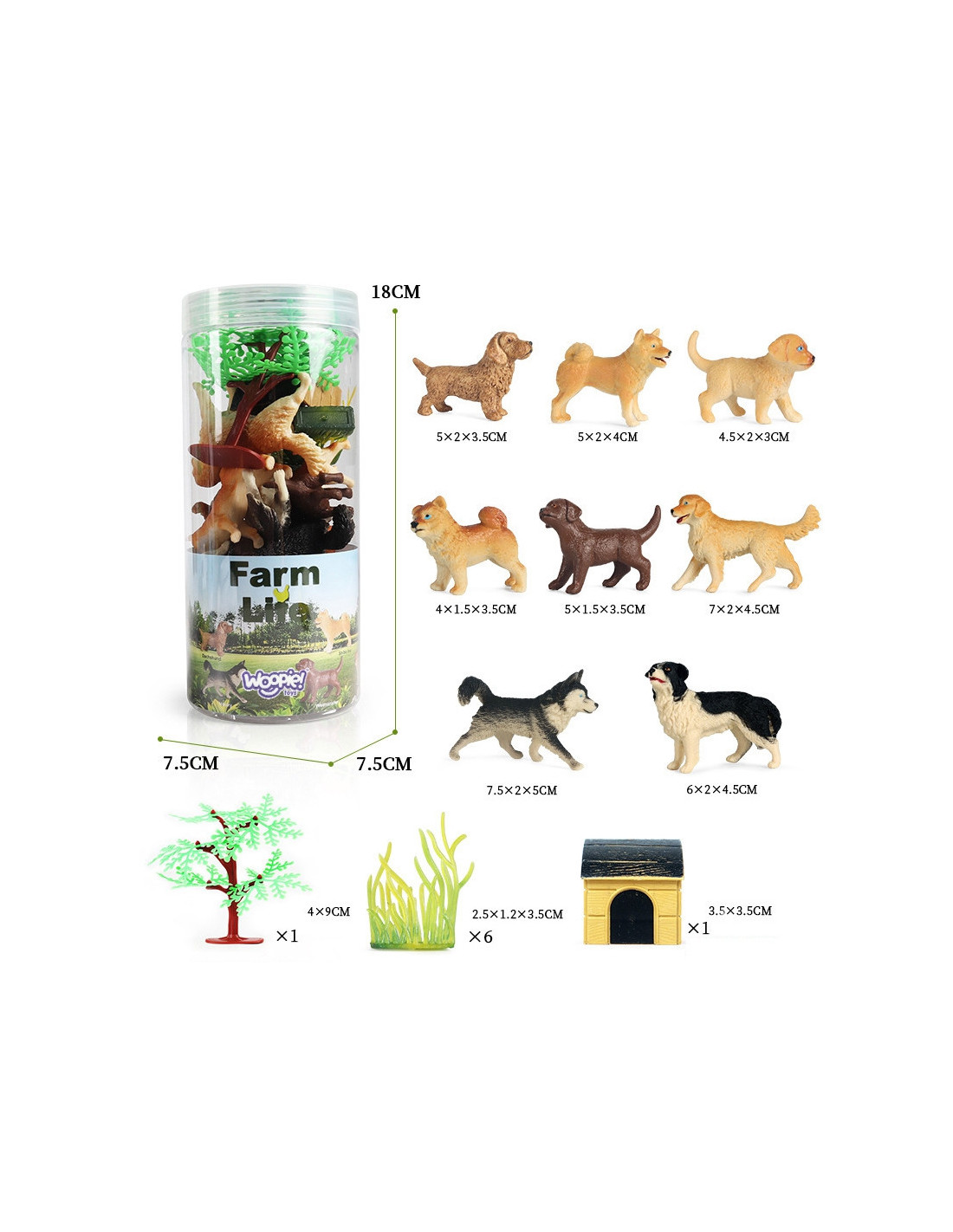 The WOOPIE Figurine Set is the perfect set for any animal fan. The set includes 6 dogs , a tree, 6 plants, and a doghouse . These realistic-looking figurines will enhance a young collector's collection , serve an educational purpose , and provide fun that will expand the scope of your little one's imagination and creativity.