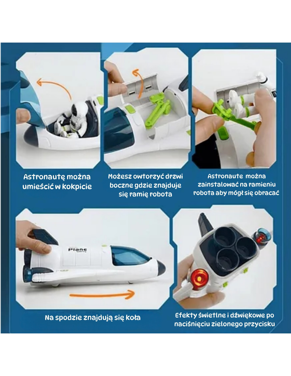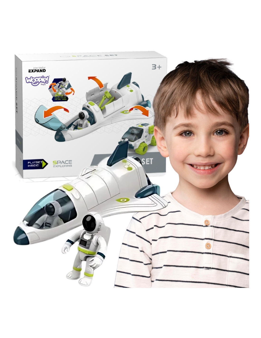 Enter the world of fascinating space exploration with the Woopie Space Shuttle and Rover Set ! It's perfect for little explorers who dream of conquering alien planets. Thanks to its clever design and interactive features, children not only have fun but also develop their cognitive, motor, and imagination skills. The shuttle's side doors open to reveal the loading area, and the movable robotic arm , to which an astronaut figure can be attached, rotates and simulates space exploration. On the rover's roof is an interactive radar – with the press of a button, the antenna automatically raises, adding an extra element of fun and surprise. That's not all! After completing the mission, simply press the front bumper and the radar automatically retracts – it's like real space technology in miniature! The set offers light and sound effects , moving parts , and educational features that support children's development on many levels. It's not just a toy - it's the beginning of a real interstellar adventure that starts in your home!