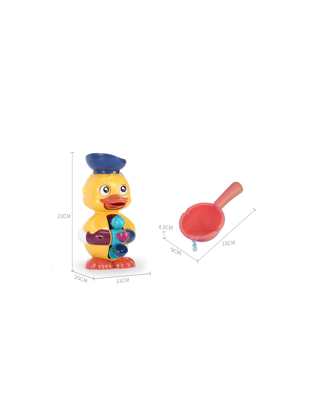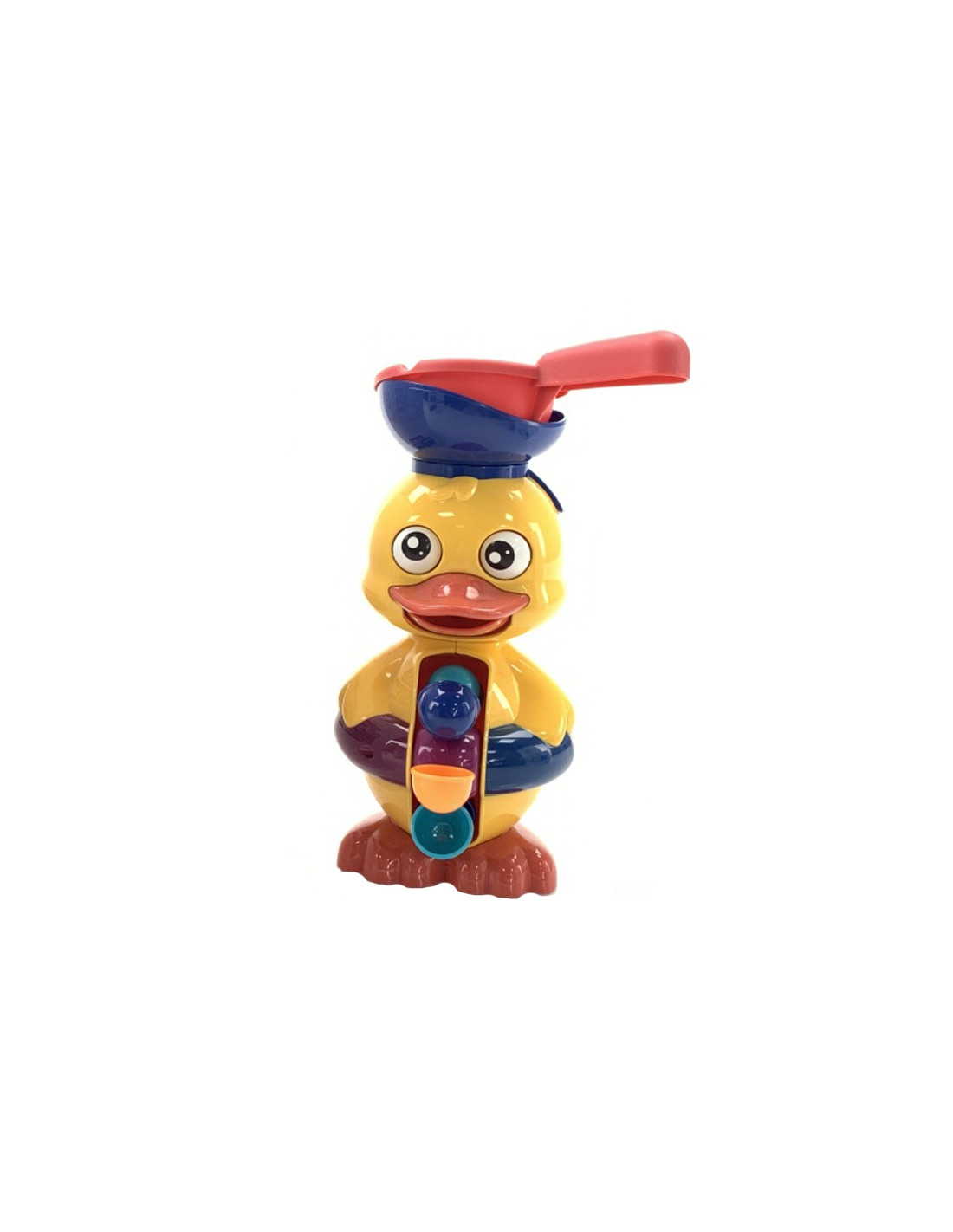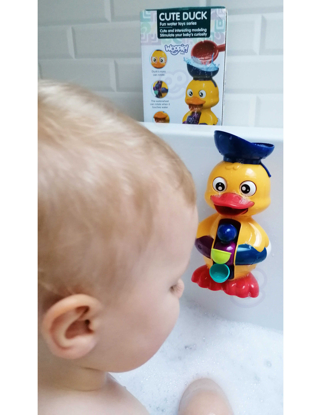 The WOOPIE Duck Water Toy will provide hours of bathtime fun and more. Children use a spatula to pour water into the duck's cap. As water is poured, the duck's eyes will spin , its mouth will open , and water will flow into the spinning wheel on its belly. Additionally, the toy has two suction cups on the back, allowing it to be attached to a bathroom wall or bathtub. This toy will not only keep bathtime fun, but also develop children's imagination, manual dexterity , and awareness of the world around them . Above all, it will allow them to focus and engage while washing.