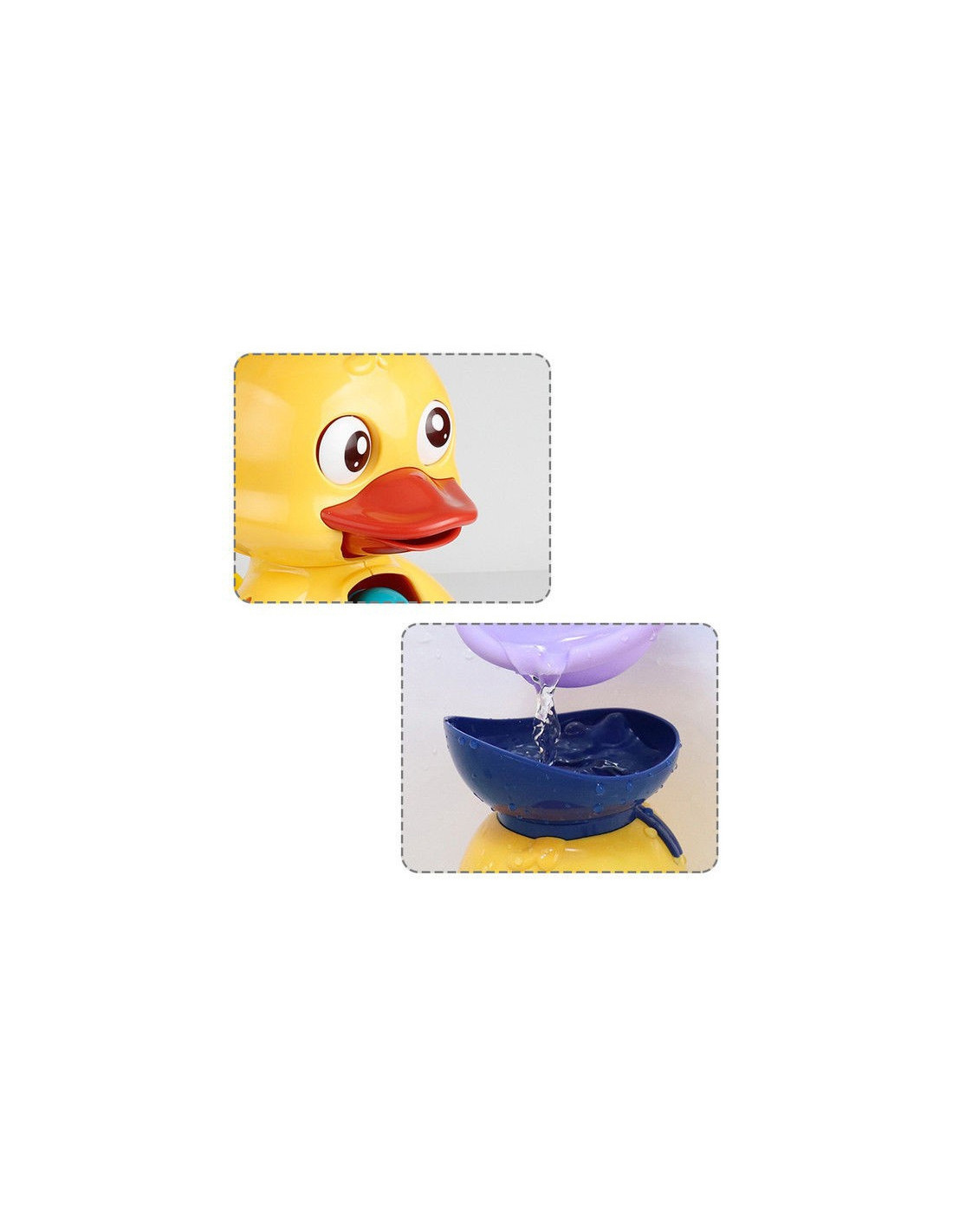 - - when pouring water, the duck's eyes will spin in circles , its mouth will open and pour water into the spinning wheel placed on its belly,