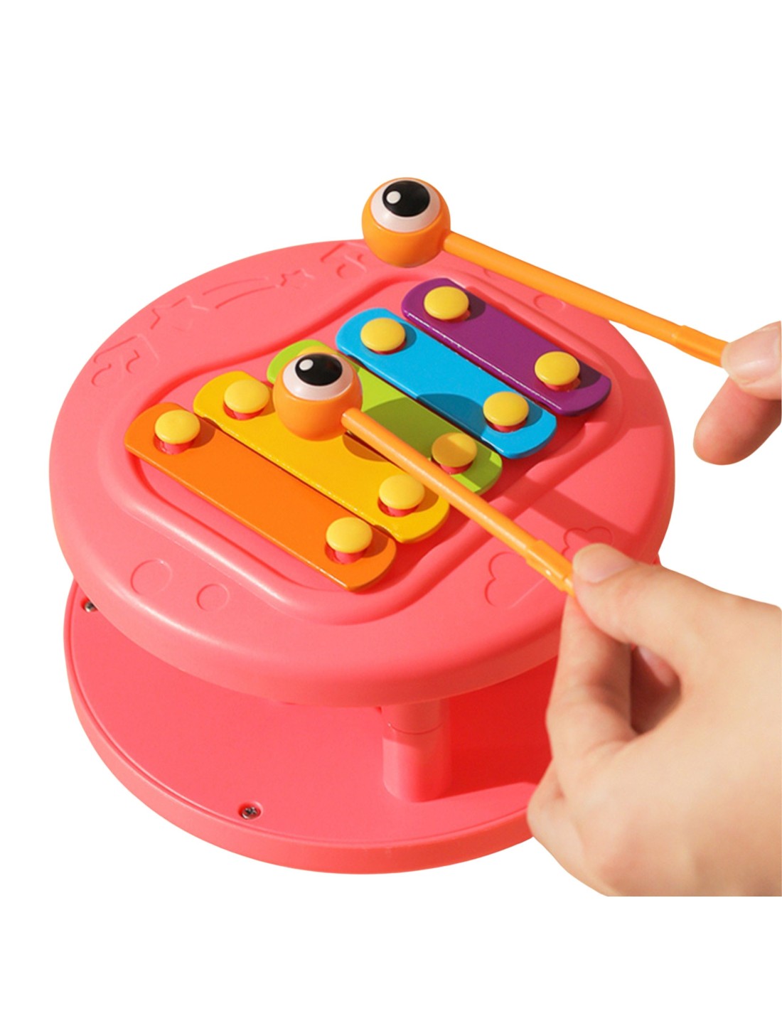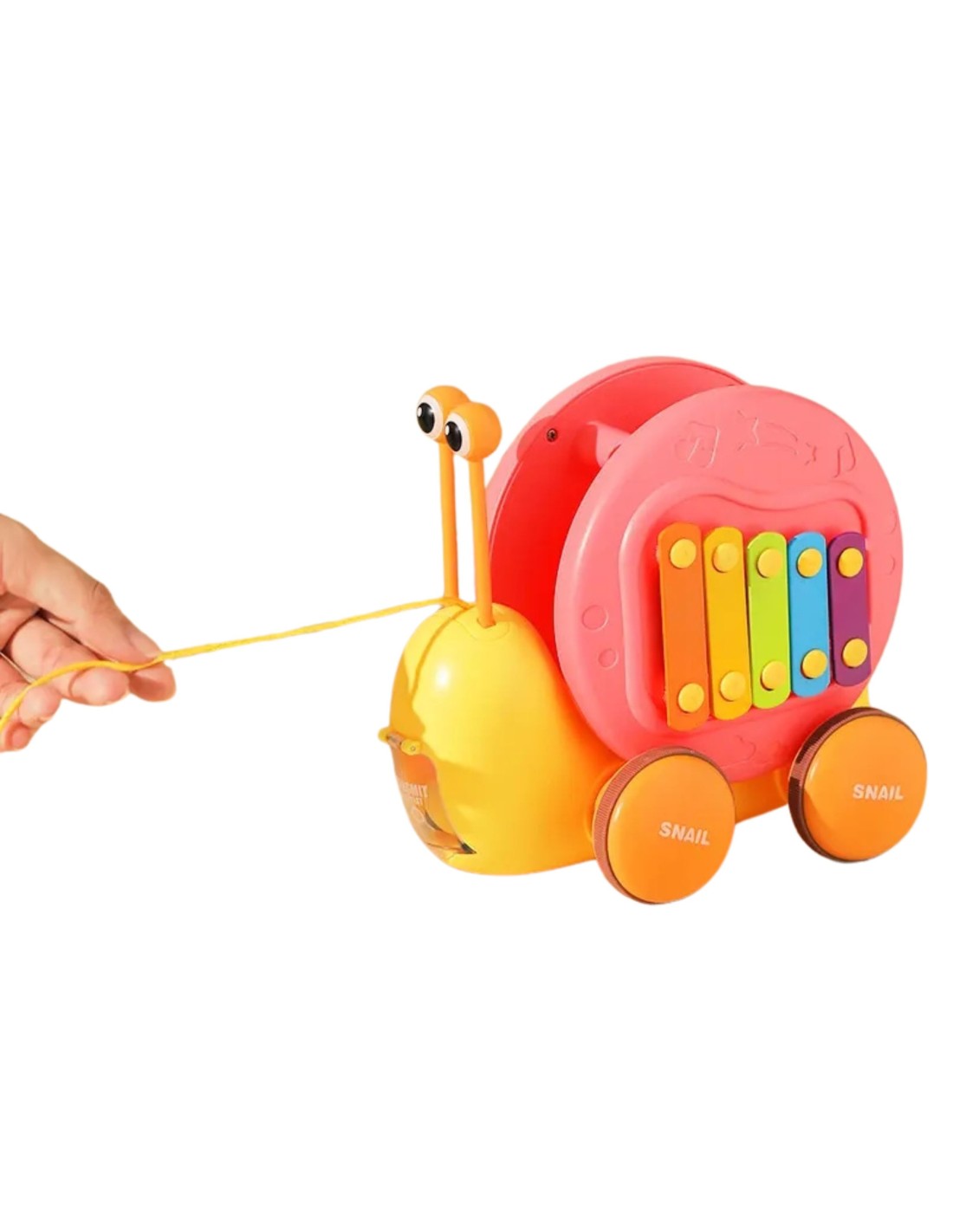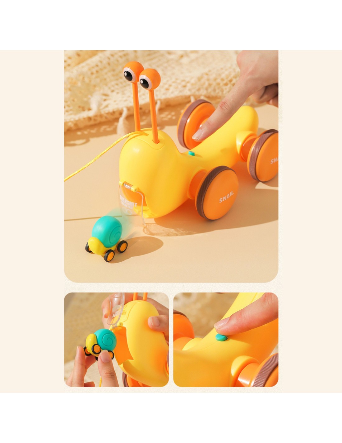A multi-functional snail push toy from WOOPIE that captures children's attention and stimulates their imagination. Bright colors also enhance their visual perception and aesthetic sense. The snail pull toy offers a variety of ways to play and learn. You can hit the keys to practice children's hearing and hand - eye coordination. You can also pull the snail on a leash or push it and let it slide across the floor, which increases the fun and challenge. While playing, children learn about animals, music, and cause-and-effect relationships. It encourages observation, logical thinking , and physical coordination , while your child can enjoy hours of creative play. The snail pull toy is a great way to share happy time with children. Moms can play with their little ones and watch them giggle as the snail moves. This toy is suitable for family interaction and can strengthen mutual feelings . The toy consists of two parts: a snail shell, which contains cymbals, and eye-shaped sticks (located inside the shell). The second part is a launcher for a small car made of the snail's body. There's a button on the toy's back that opens the launcher for the car.