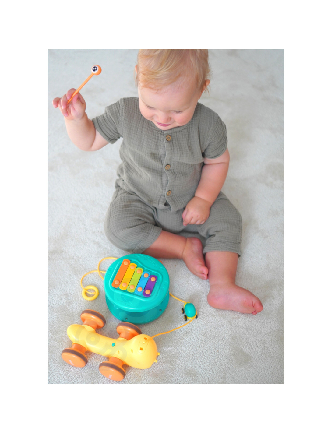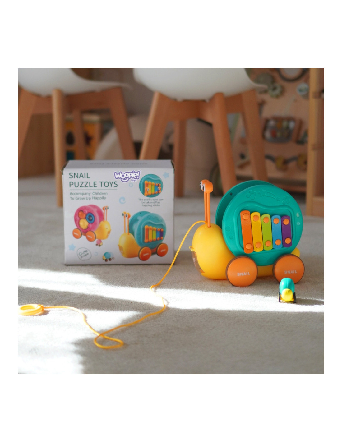 A multi-functional snail push toy from WOOPIE that captures children's attention and stimulates their imagination. Bright colors also enhance their visual perception and aesthetic sense. The snail pull toy offers a variety of ways to play and learn. You can hit the keys to practice children's hearing and hand - eye coordination. You can also pull the snail on a leash or push it and let it slide across the floor, which increases the fun and challenge. While playing, children learn about animals, music, and cause-and-effect relationships. It encourages observation, logical thinking , and physical coordination , while your child can enjoy hours of creative play. The snail pull toy is a great way to share happy time with children. Moms can play with their little ones and watch them giggle as the snail moves. This toy is suitable for family interaction and can strengthen mutual feelings . The toy consists of two parts: a snail shell, which contains cymbals, and eye-shaped sticks (located inside the shell). The second part is a launcher for a small snail car . There's a button on the toy's back that opens the launcher for the car.
