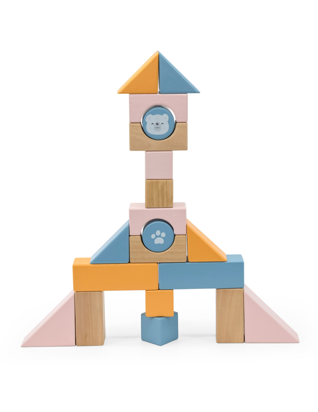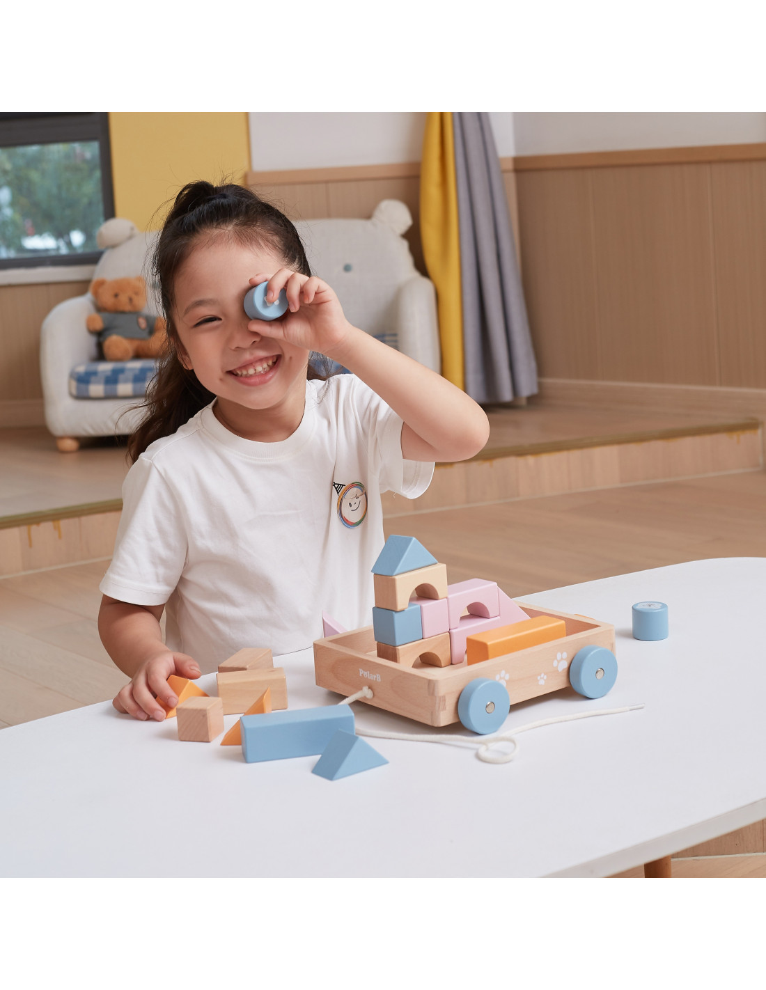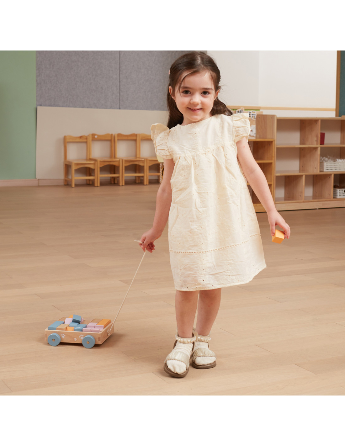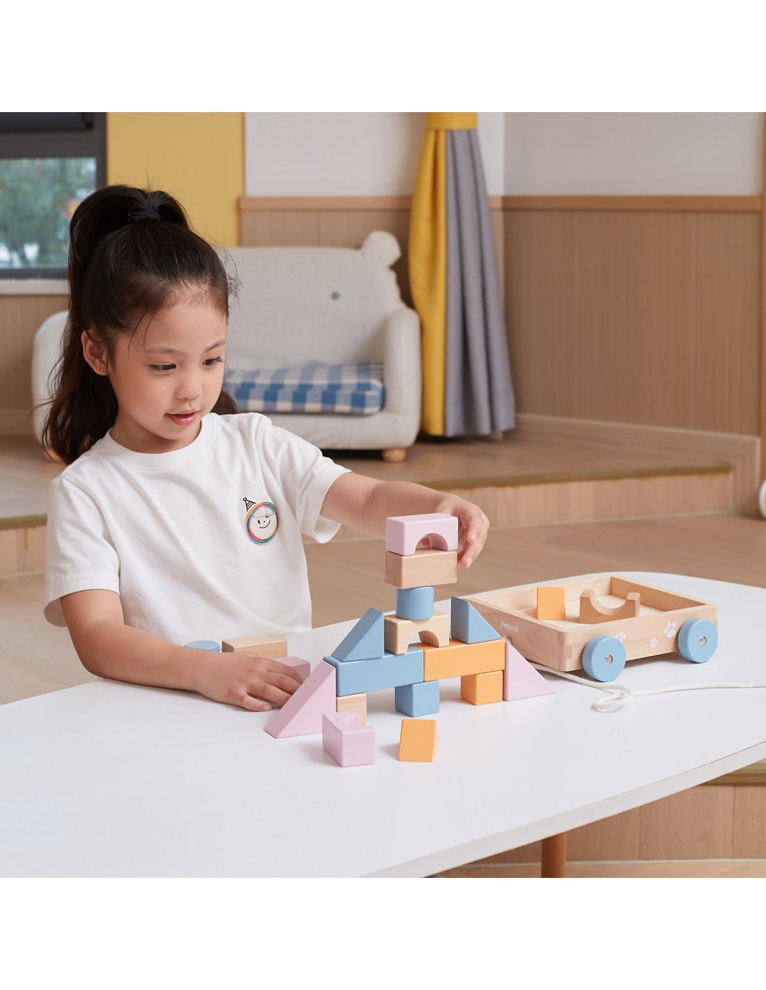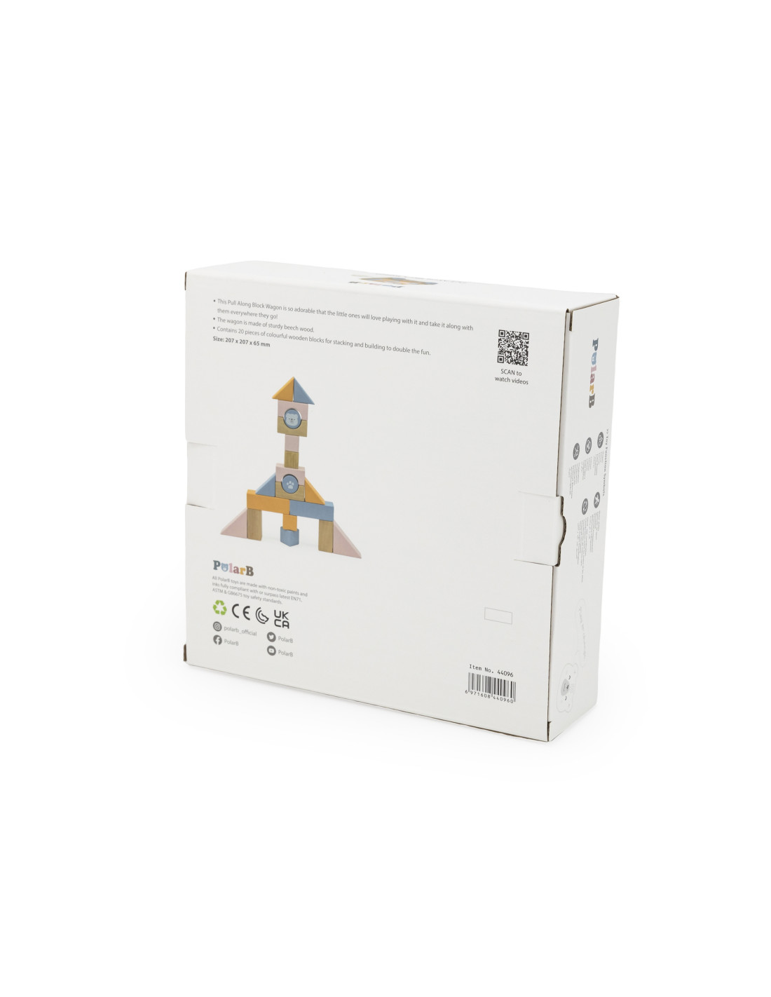 The Wooden Pull Cart from VIGA PolarB features pastel-colored blocks placed on a comfortable cart. With 20 wooden blocks, you can create imaginative buildings with various shapes, colors, and prints. Fine motor skills and creativity are encouraged by playing with wooden construction elements. The buildings are made of beech wood, varnished, in harmonious colors, and child-safe. After playing, the blocks can be sorted back into the cart, and in a flash, everything is organized again. Using a string, the child can pull the cart with the sorted blocks across the floor.