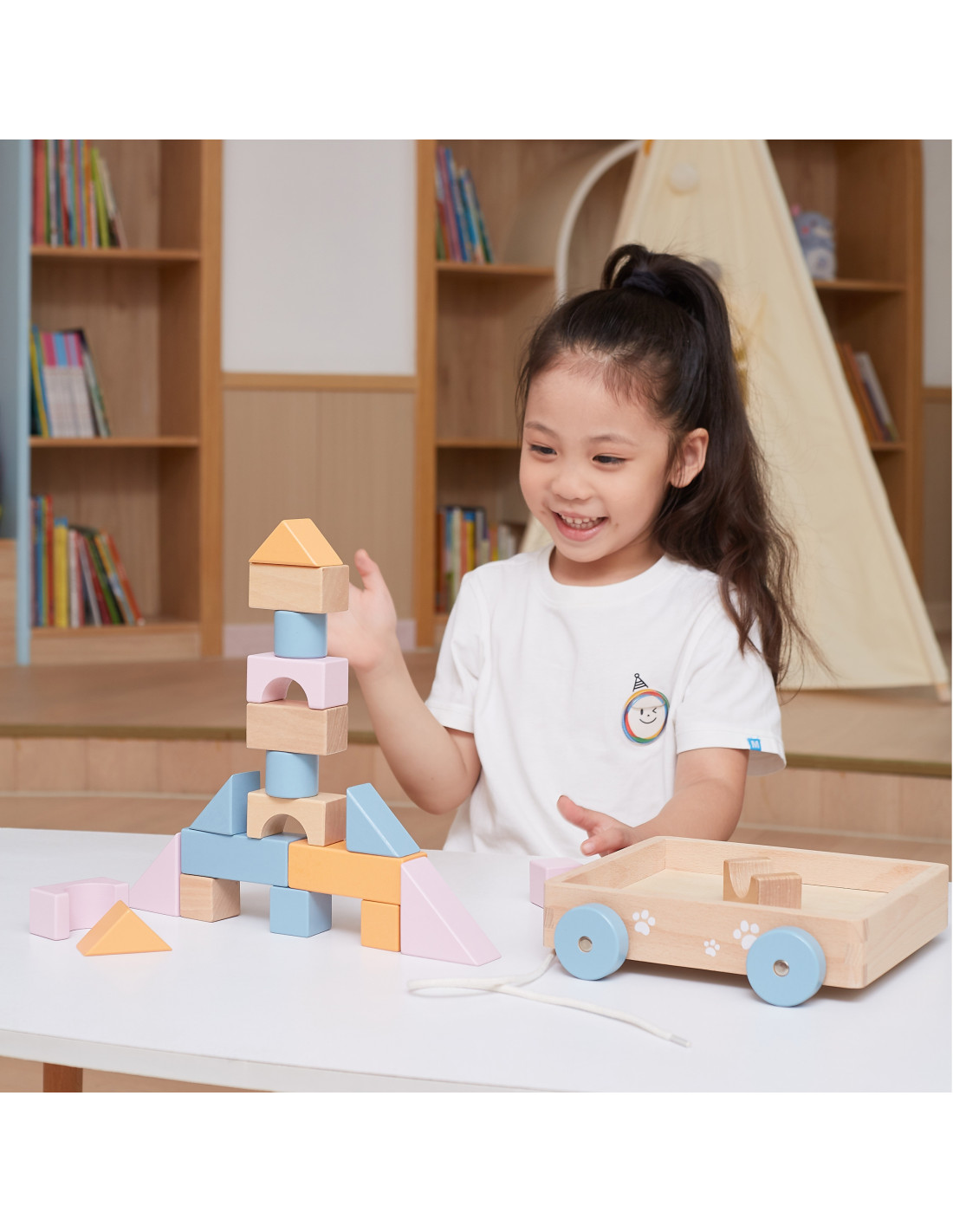 - - The set contains 21 elements, including 20 blocks and a cart with a string