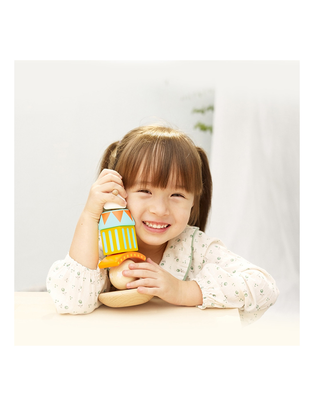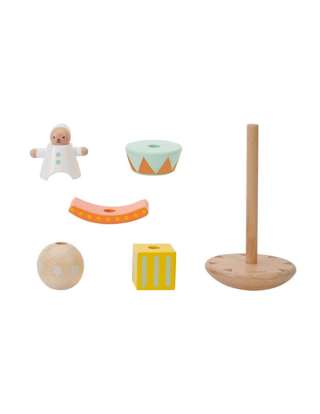 - - The set includes four colorful wooden elements, a stand with a stake for stacking blocks , and a cheerful clown .