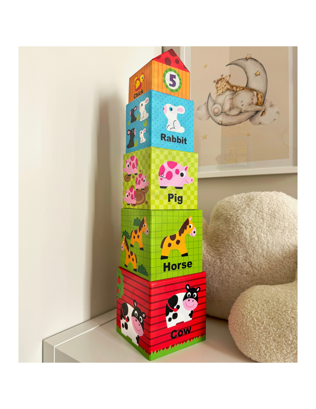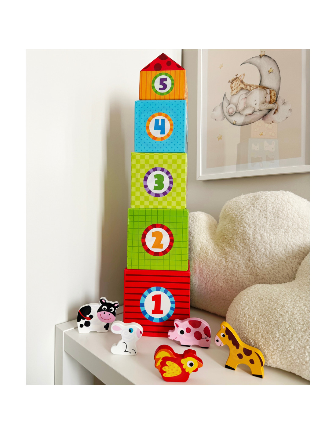 The set is not only entertaining but also educational – it teaches counting, animal identification, and develops spatial perception and imagination. The cubes can also be used to store small items such as crayons or figurines.