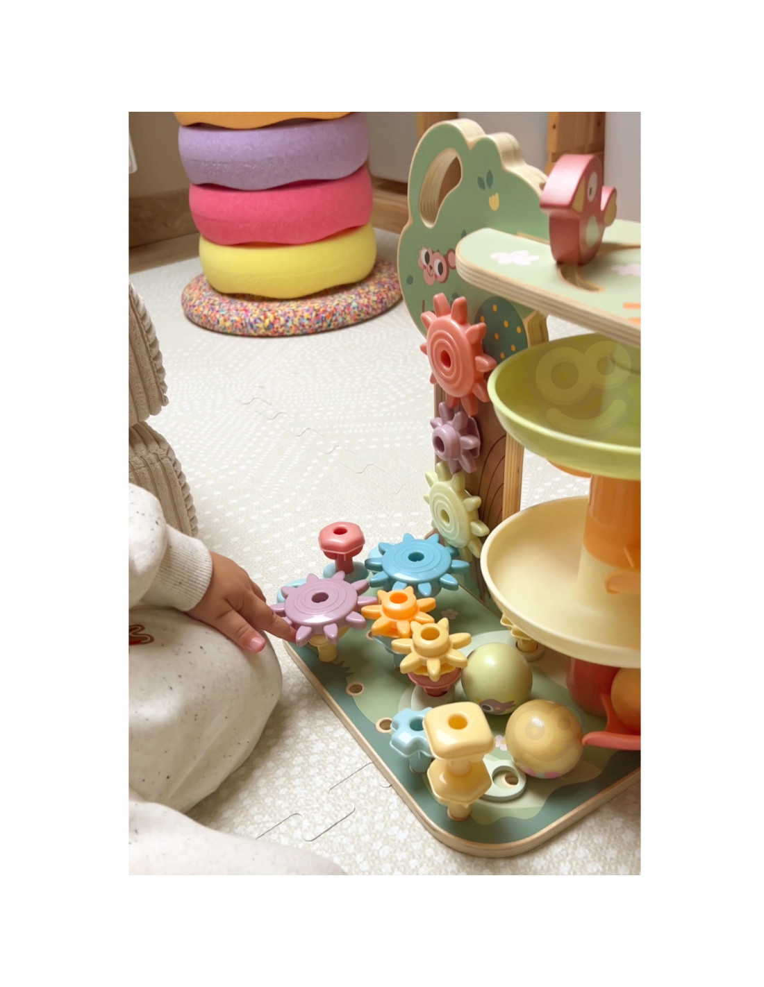 A colorful ball track, sensory gears, pegs for inserting, and a creative threading machine – all in a beautiful, pastel setting and made of safe, durable materials