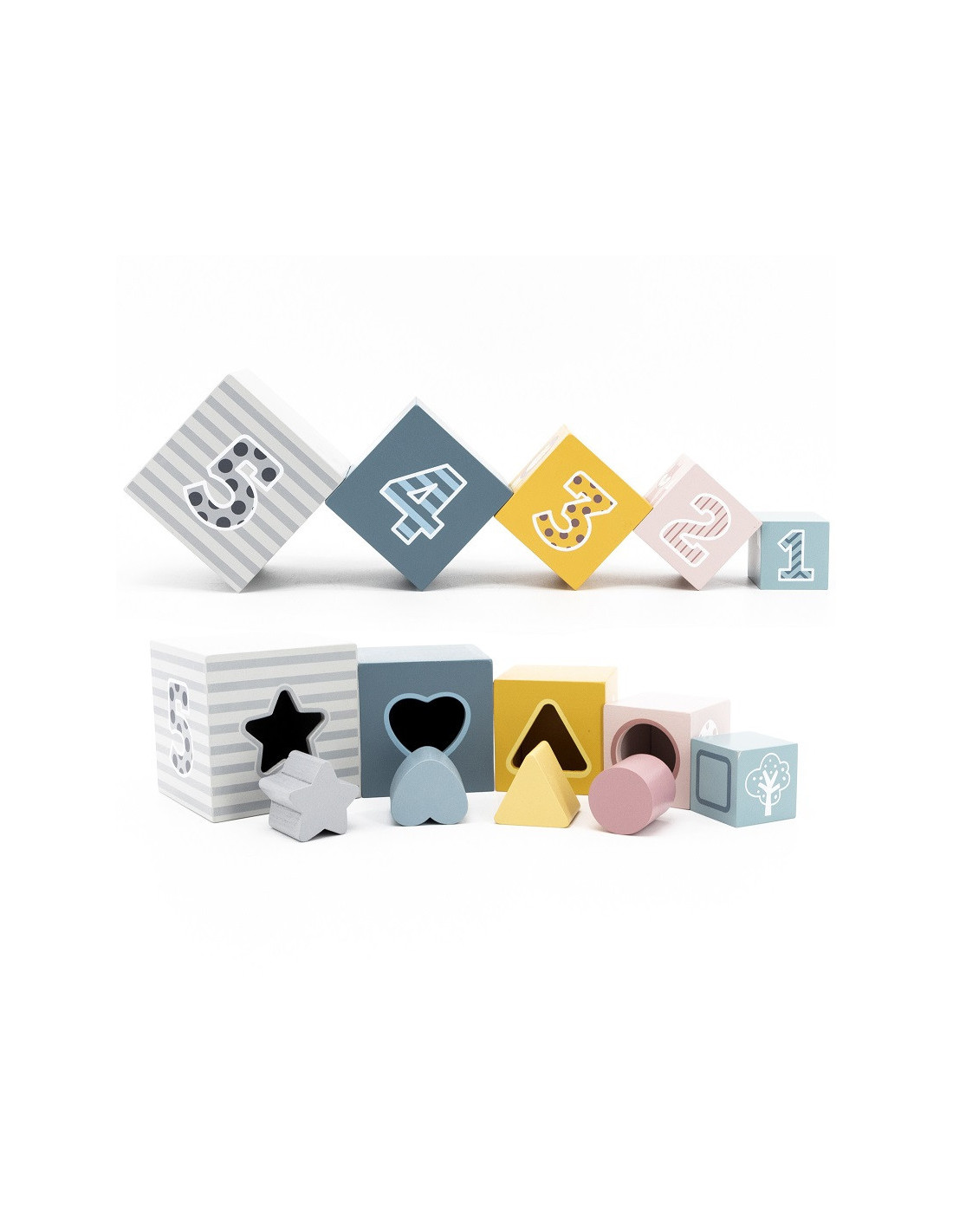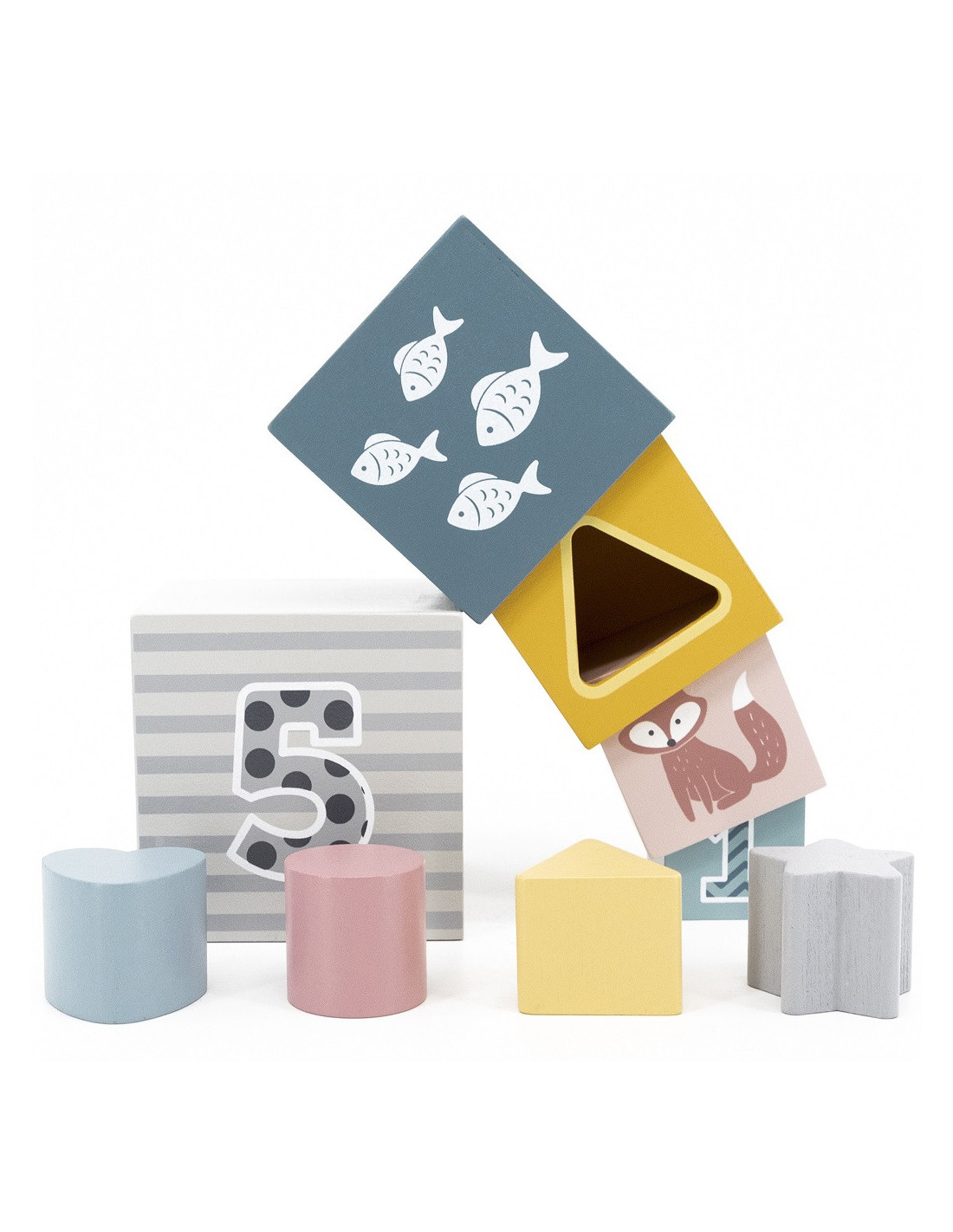 - - the set consists of 5 boxes of different sizes and 4 blocks of different geometric shapes,