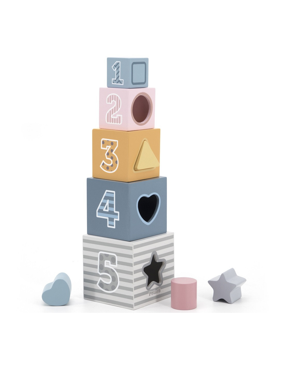 This colorful educational pyramid with a shape sorter is a toy beloved by children. Its delicate pastel colors and aesthetic appeal encourage children to play.