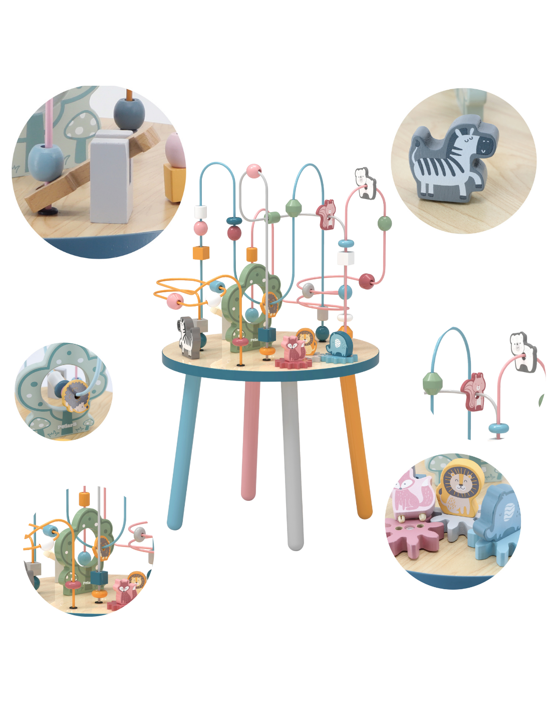 This wooden activity table will provide toddlers with tons of fun, and while playing, they'll develop their manual skills and color and shape perception. Colorful wooden blocks and three blocks featuring animals – a teddy bear, a fox, and a hedgehog – are attached to metal loops. Toddlers can move the blocks in any way they like, developing precision finger and hand movements. Additionally, on the table, beneath the loop, are other animals and plants, a must-have in any zoo. This allows children to have fun making up stories about the animals, while developing their creativity and imagination.