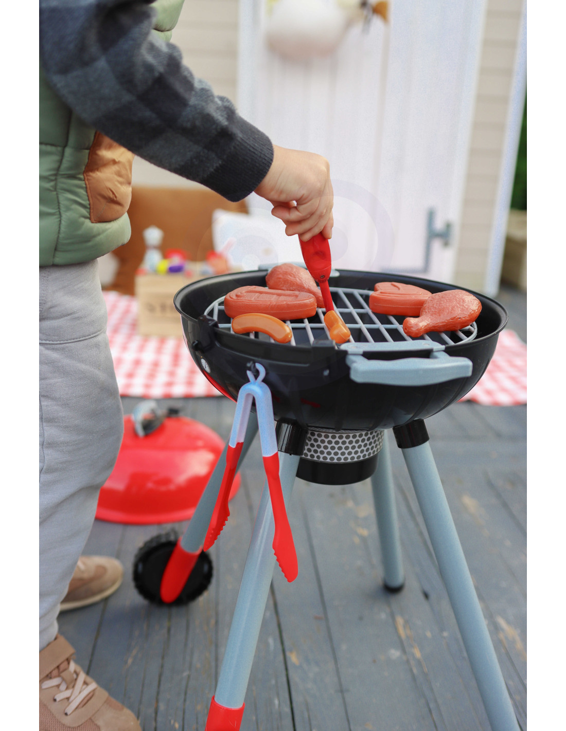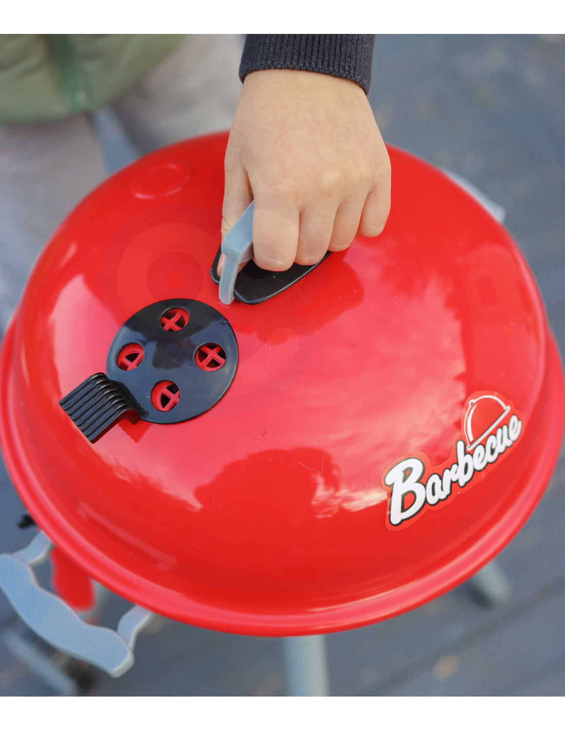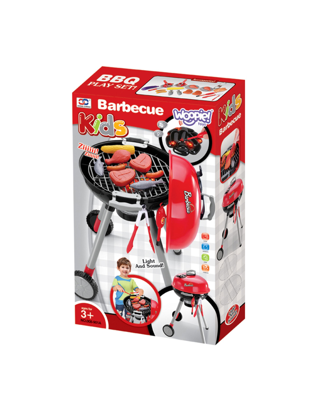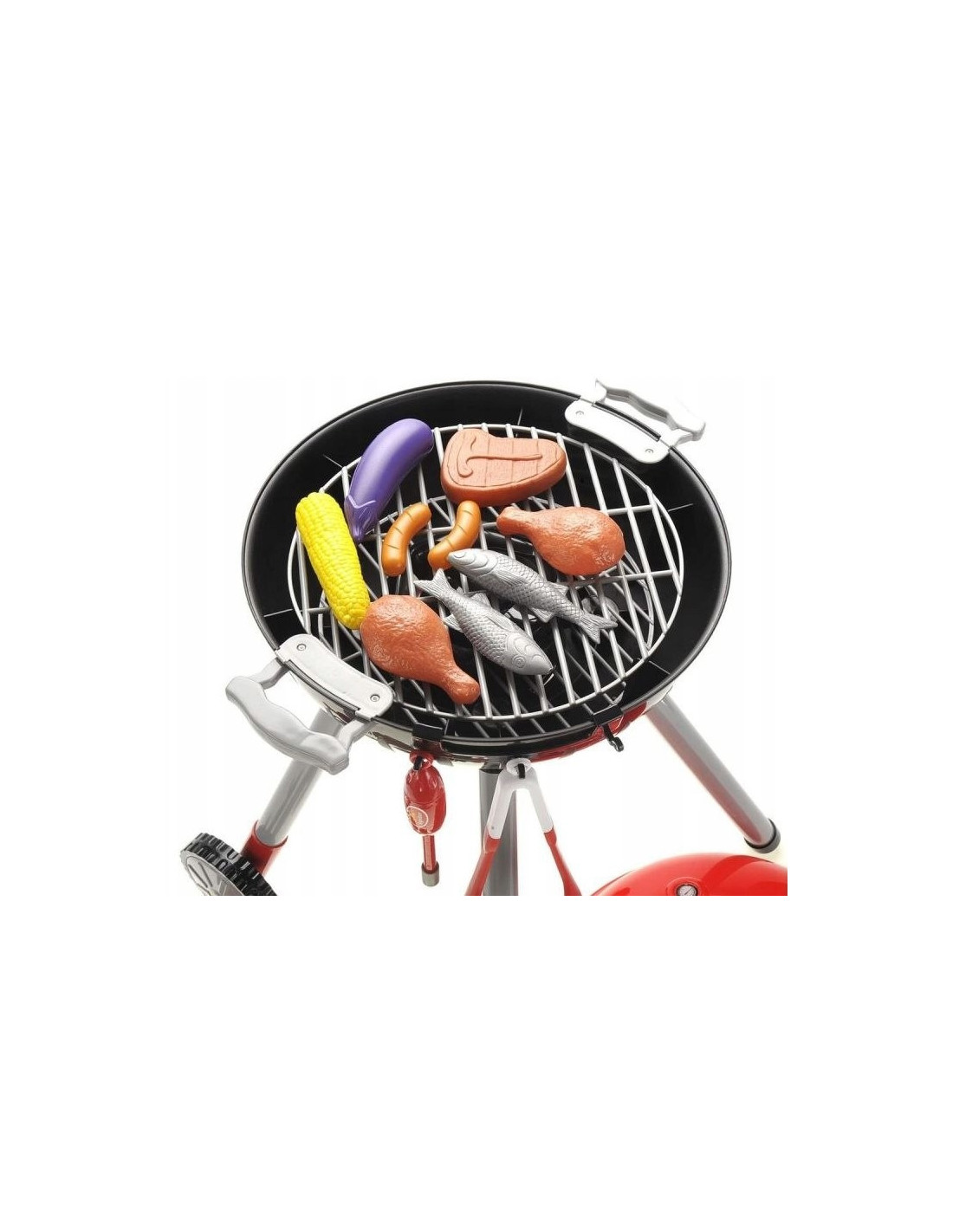 The WOOPIE Barbecue Grill is just like a real grill! The set includes everything you need to grill: coals, a lighter, tongs, sausages, steaks, chicken, fish, and corn. Light and sound effects add to the realism . To ignite the grill, simply hold the lighter close and hear the distinctive sound and glowing red coals (the module can be turned off at any time with a button). The removable cover protects the "hot" grate after grilling, and the wheels and convenient handle allow you to transport the grill anywhere in the garden or home. Your child will be able to pretend to be a father watching over the family barbecue.