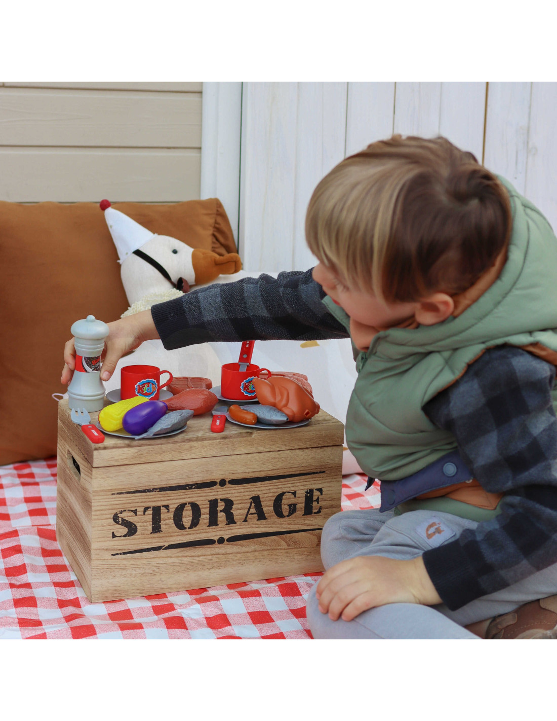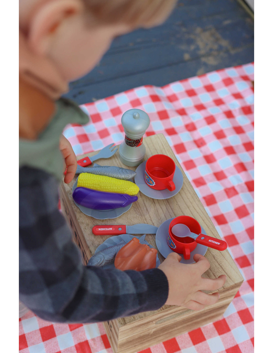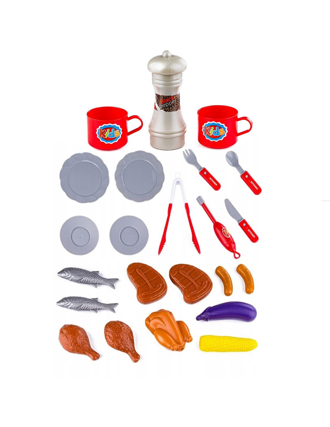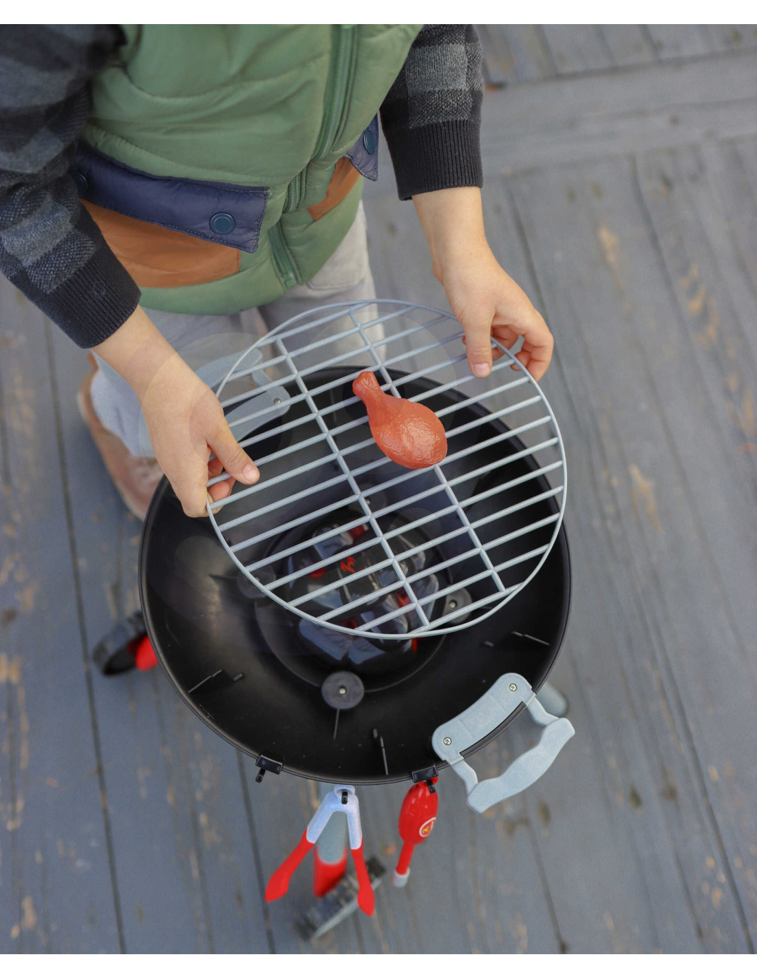 The WOOPIE Barbecue Grill is just like a real grill! The set includes everything you need to grill: coals, a lighter, tongs, sausages, steaks, chicken, fish, and corn. Light and sound effects add to the realism . To ignite the grill, simply hold the lighter close and hear the distinctive sound and glowing red coals (the module can be turned off at any time with a button). The removable cover protects the "hot" grate after grilling, and the wheels and convenient handle allow you to transport the grill anywhere in the garden or home. Your child will be able to pretend to be a father watching over the family barbecue.