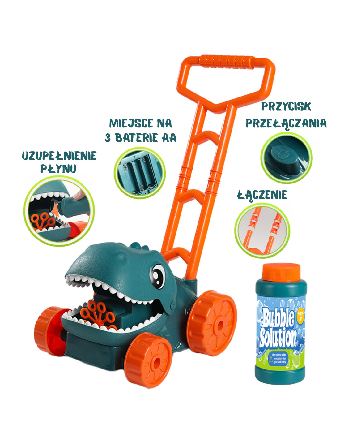 - - Automatic bubble function - after pouring the liquid and pressing the button, the toy releases hundreds of bubbles from the dinosaur's mouth.