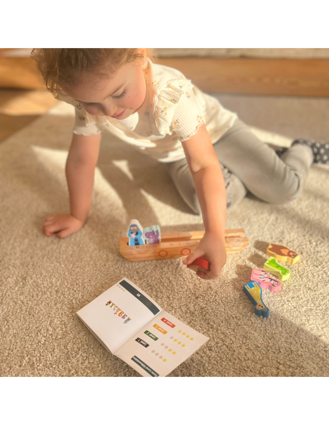 The goal of the game is to arrange the wooden figures on a base according to the instructions in the selected task. Each figure is double-sided – one side faces right, the other left. Depending on the difficulty level, the player must place all the figures on the ark so that they match the pattern shown in the diagram. In most cases, however, it is necessary to logically determine the correct place for each animal, determine who it should be next to, and which direction it should face.