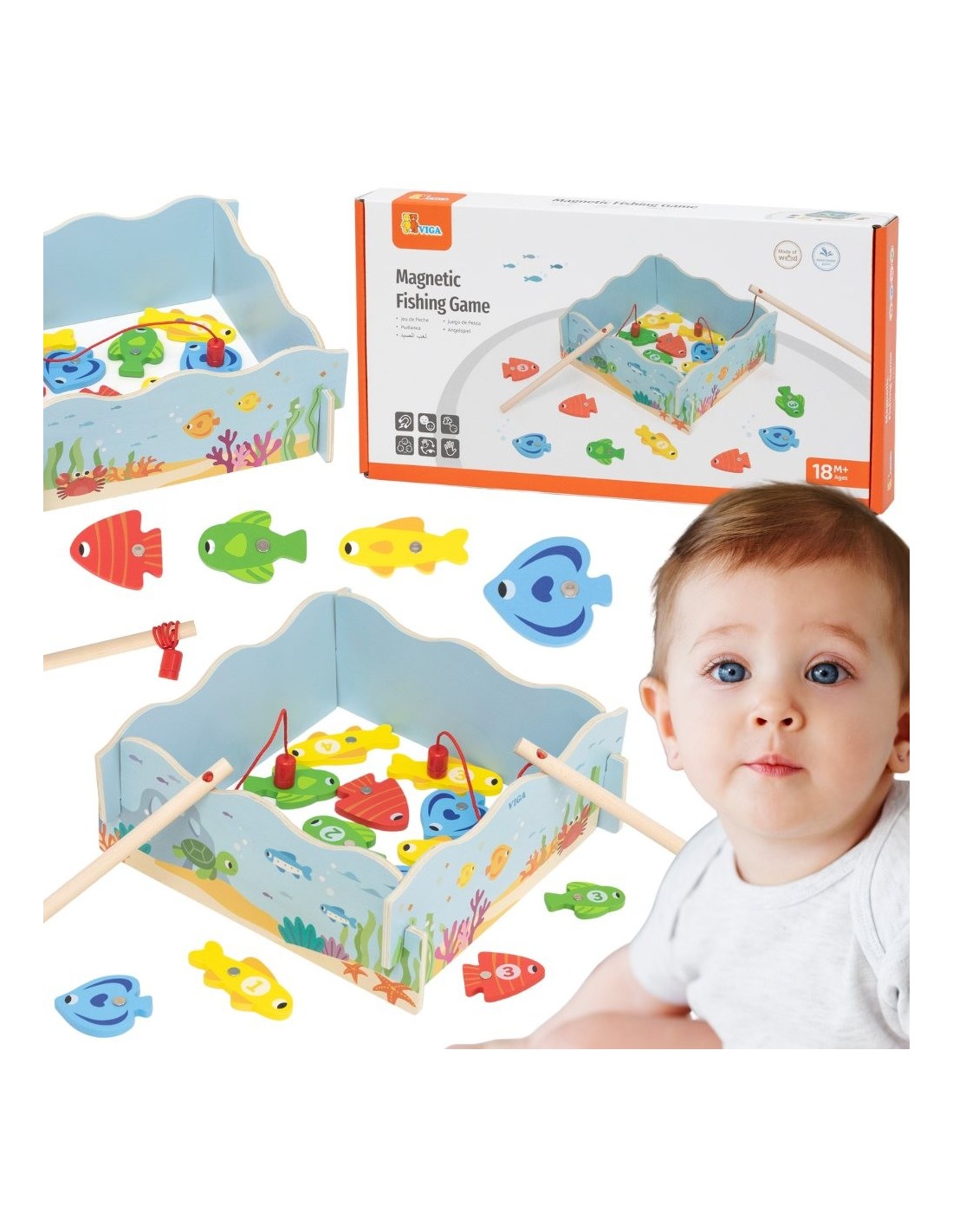 The wooden magnetic Fishing game from Viga lets your little one catch colorful fish using a safe, magnetic fishing rod. Each fish is numbered, introducing your child to the world of numbers and colors. The box acts as a pond and, after playtime, serves as storage for all the pieces. It's an ideal gift for children over 18 months , developing manual skills and eye-hand coordination.