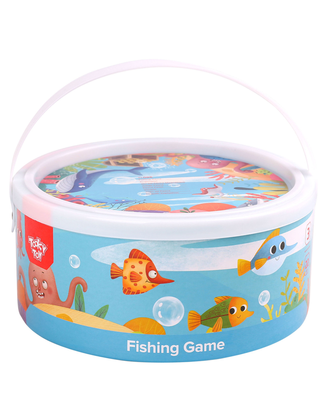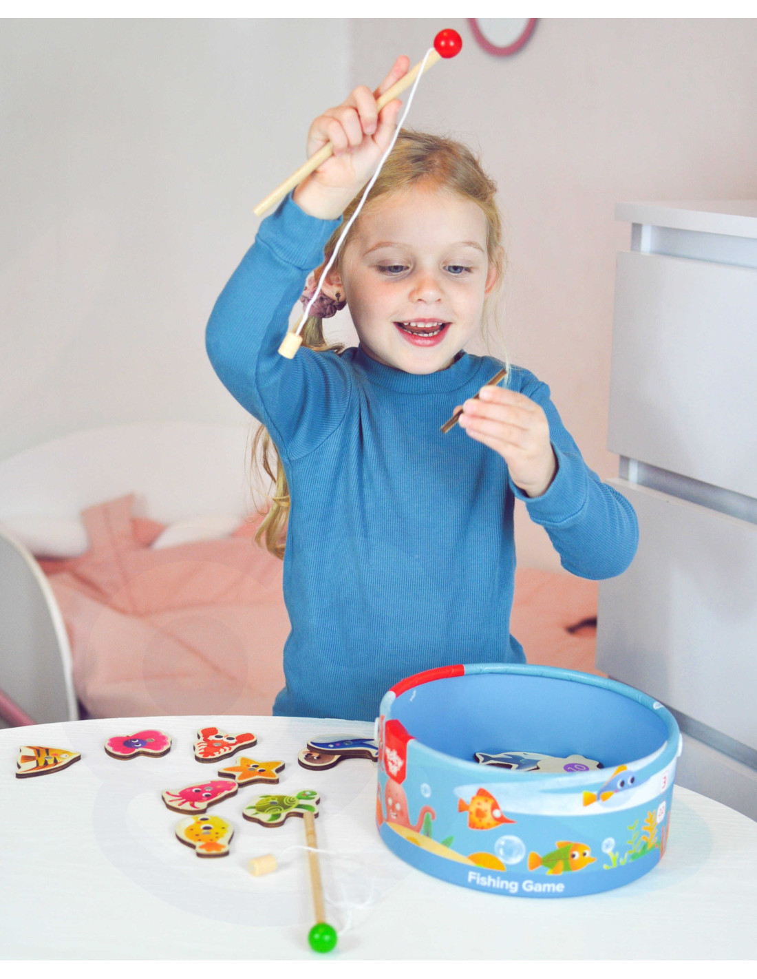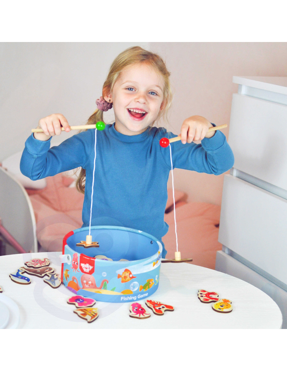 TOOKY TOY Fishing Game is a 22-piece set featuring animal motifs and built-in magnets. Two wooden fishing rods and a bucket imitating the underwater world will provide hours of fun. The game allows for both one player and a group of rascals to play. The entire set is made of varnished wood and painted with non-toxic paints in vibrant colors that will delight every user and provide plenty of fun. The game develops motor coordination , supports hand-eye coordination , and teaches patience and focus. Grab your fishing rods and let the fishing begin!