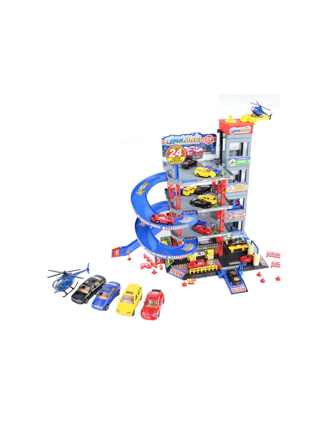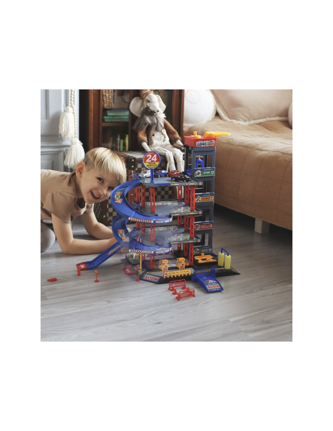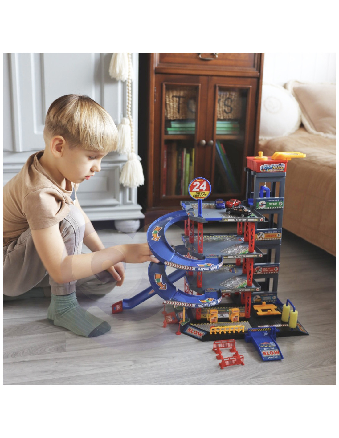 This fantastic multi-story parking garage from WOOPIE, complete with a gas station, lift, elevator, car wash, car repair shop, and helicopter landing pad, will capture the imagination of every fast car and automotive enthusiast. To access the parking lot, raise the ramp. The manually operated elevator allows vehicles to move between floors. A special, winding ramp allows for quick vehicle descent from each level. The garage also features a car wash and a gas station. The set also includes four metal cars and a helicopter.