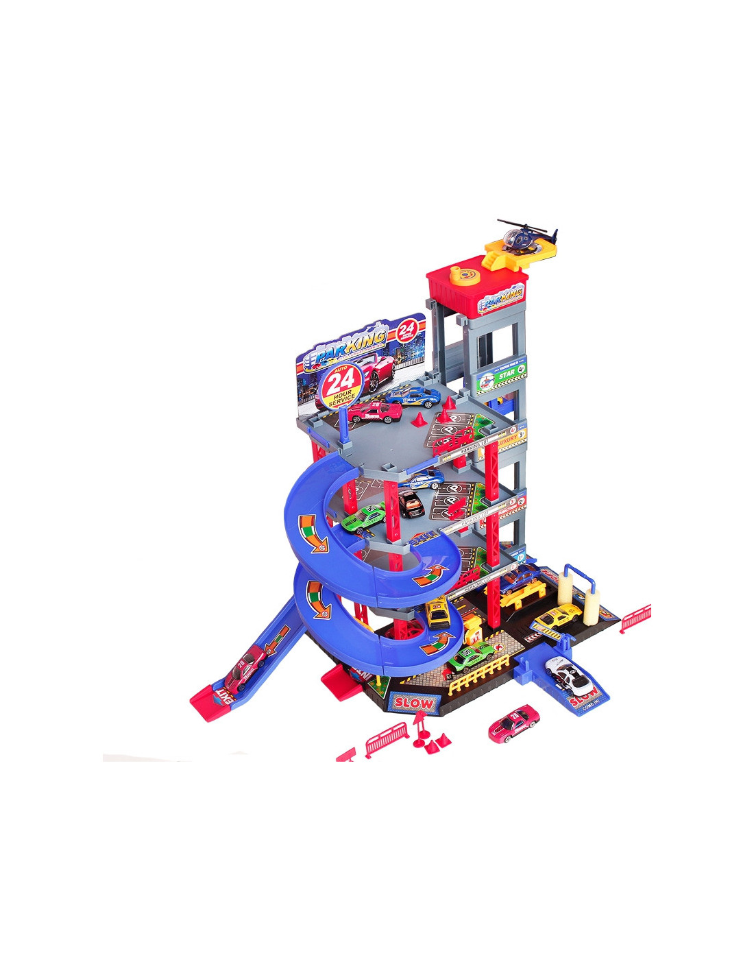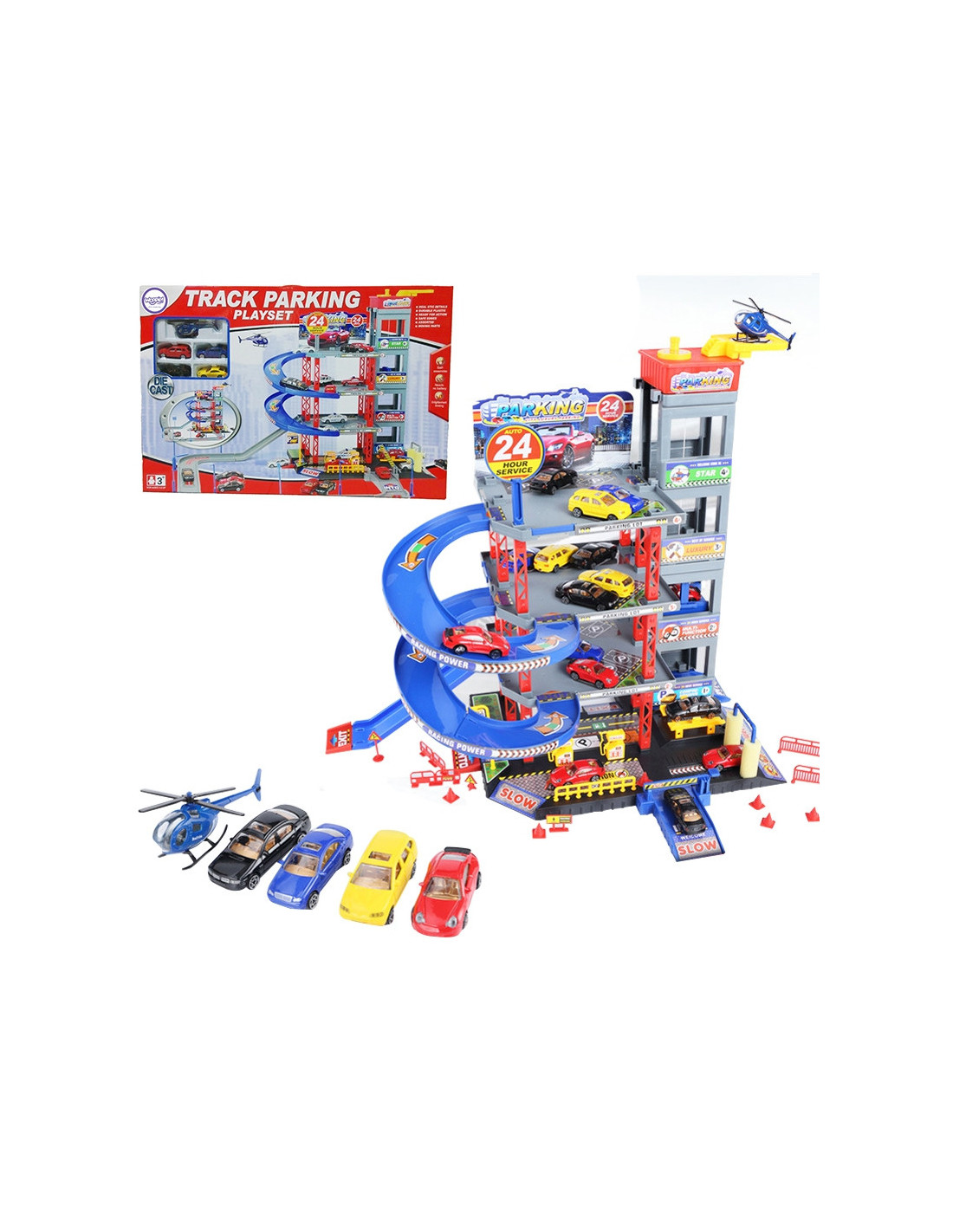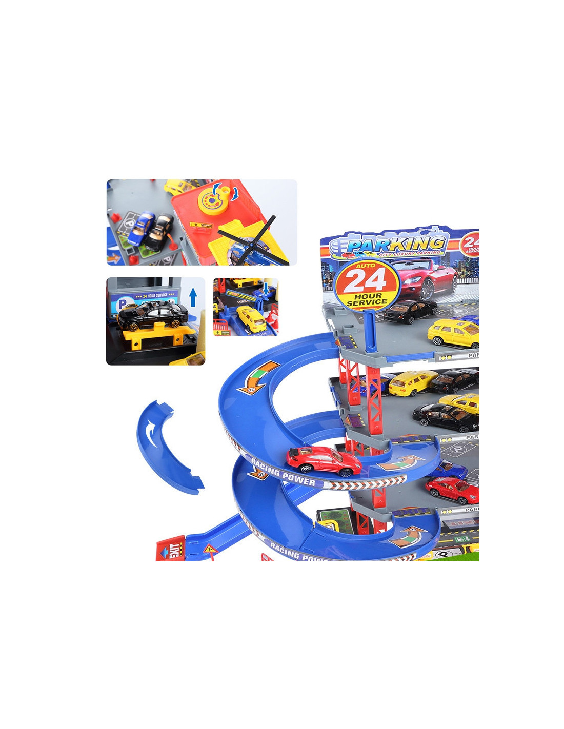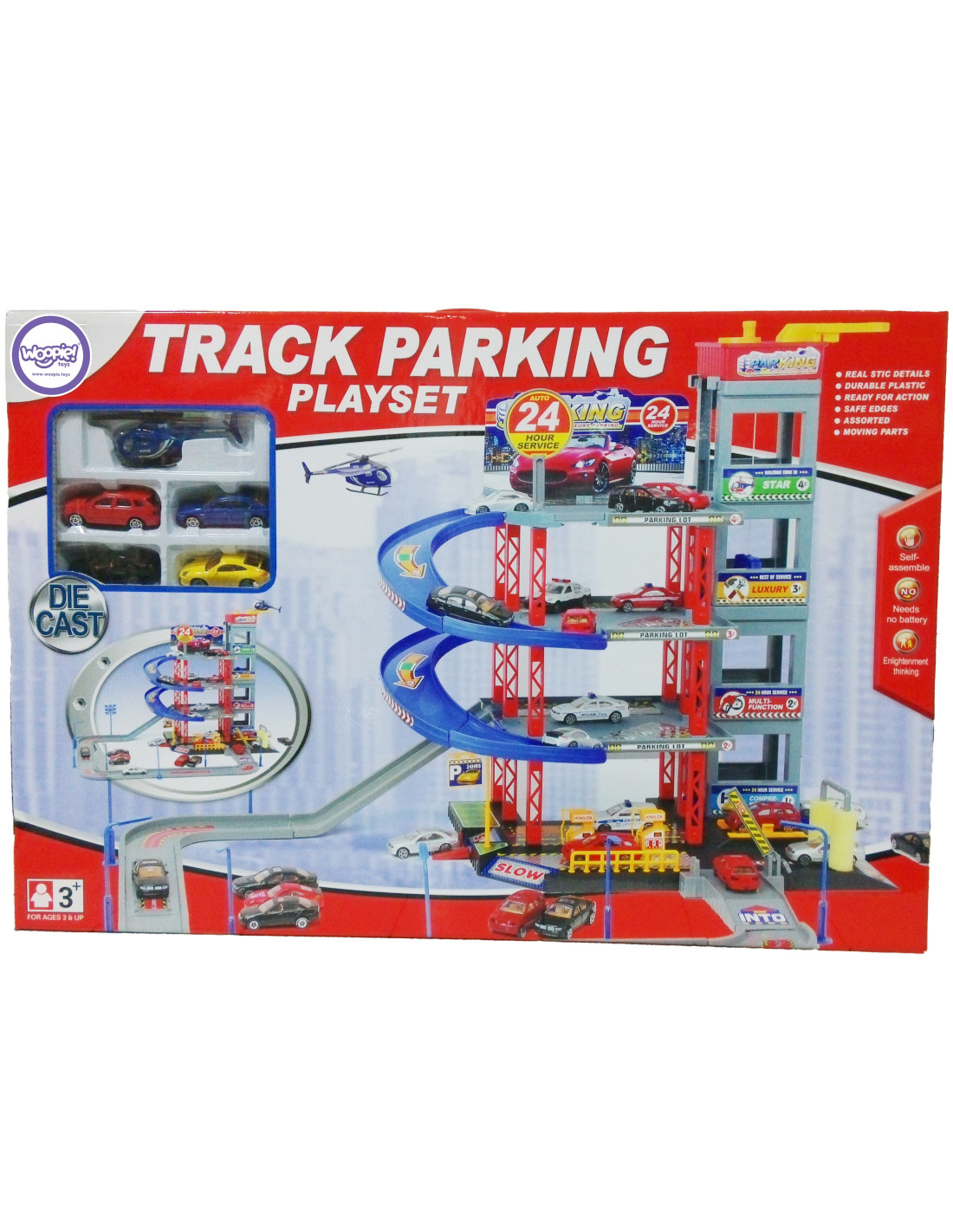 This fantastic multi-story parking garage from WOOPIE, complete with a gas station, lift, elevator, car wash, car repair shop, and helicopter landing pad, will capture the imagination of every fast car and automotive enthusiast. To access the parking lot, raise the ramp. The manually operated elevator allows vehicles to move between floors. A special, winding ramp allows for quick vehicle descent from each level. The garage also features a car wash and a gas station. The set also includes four metal cars and a helicopter.