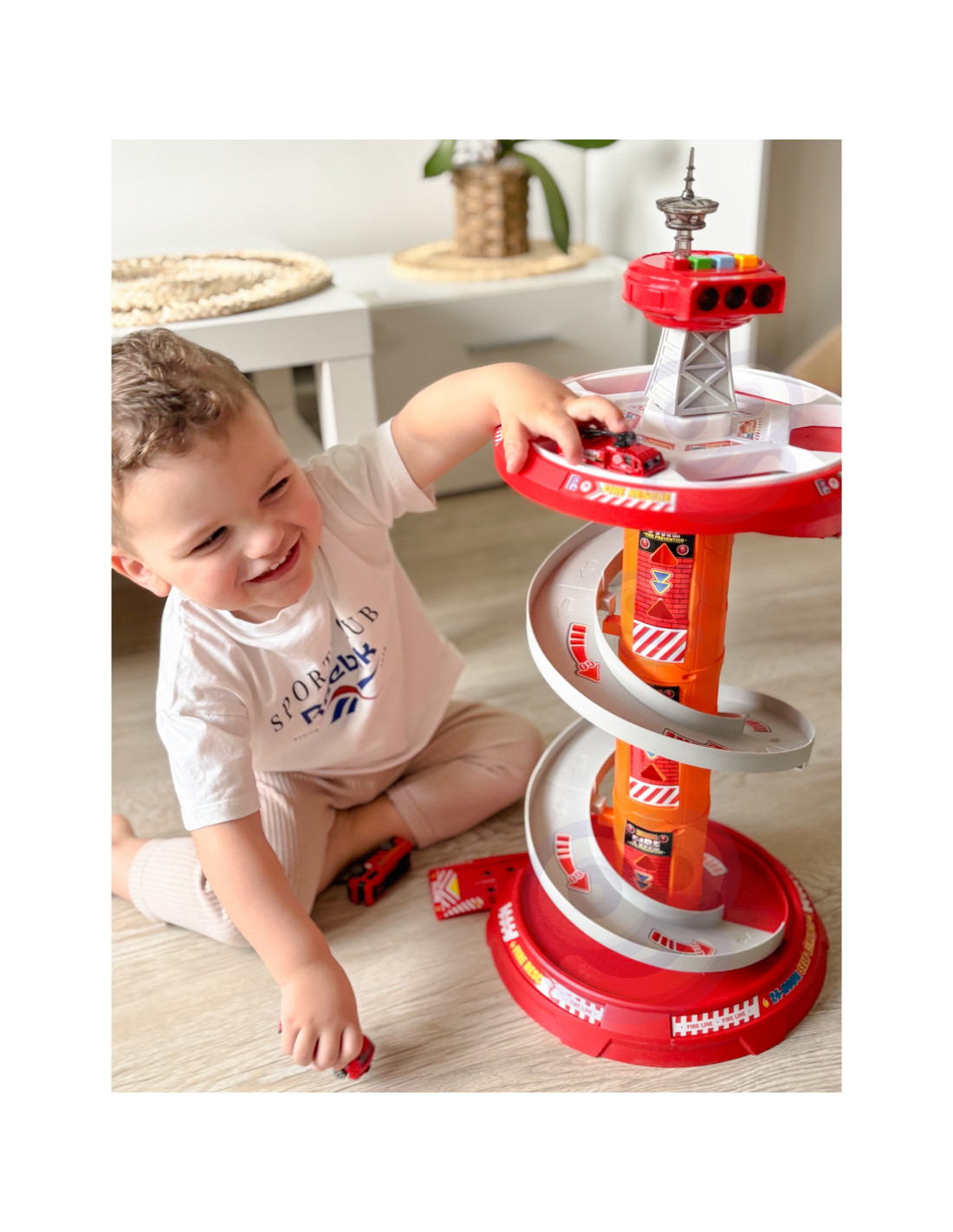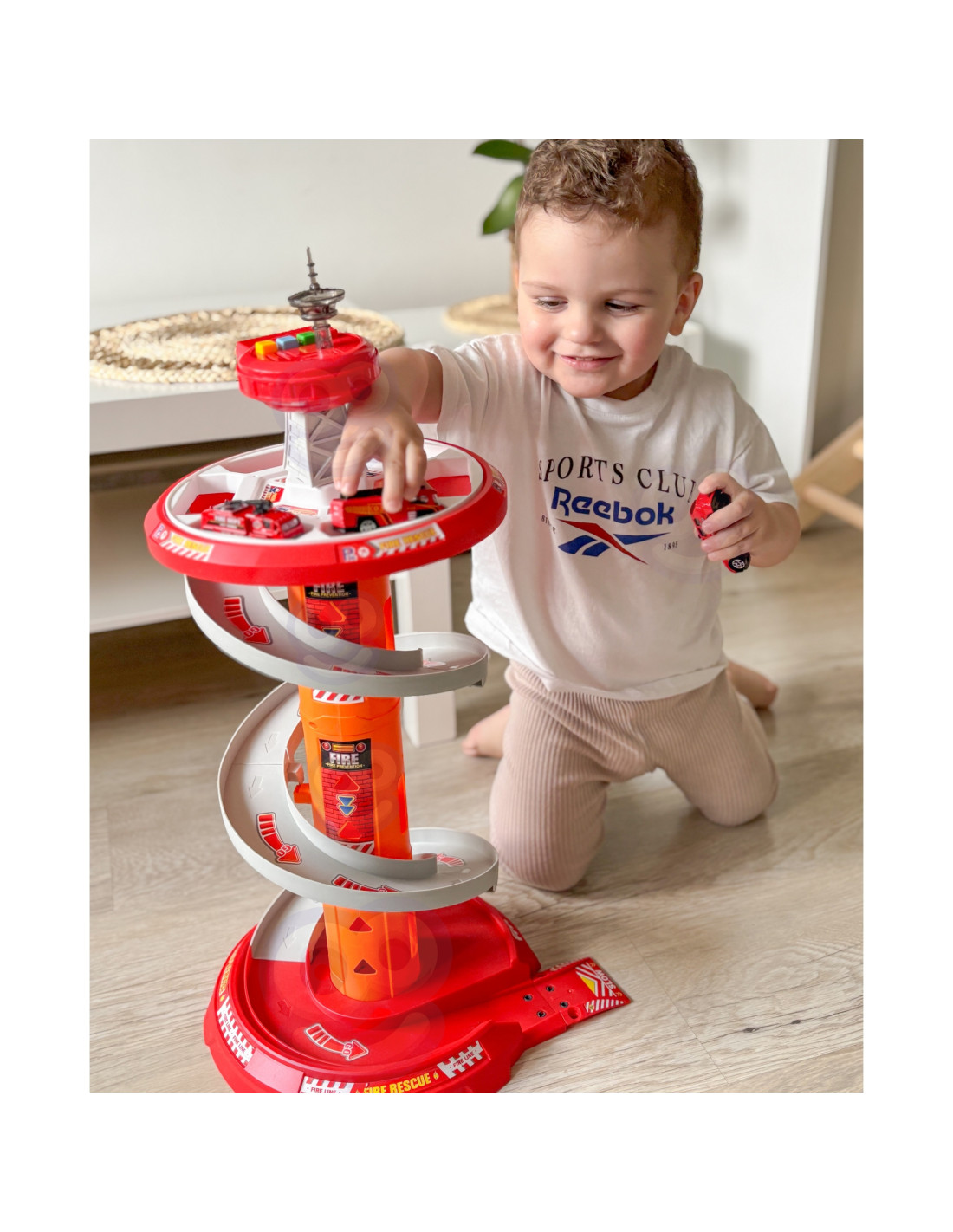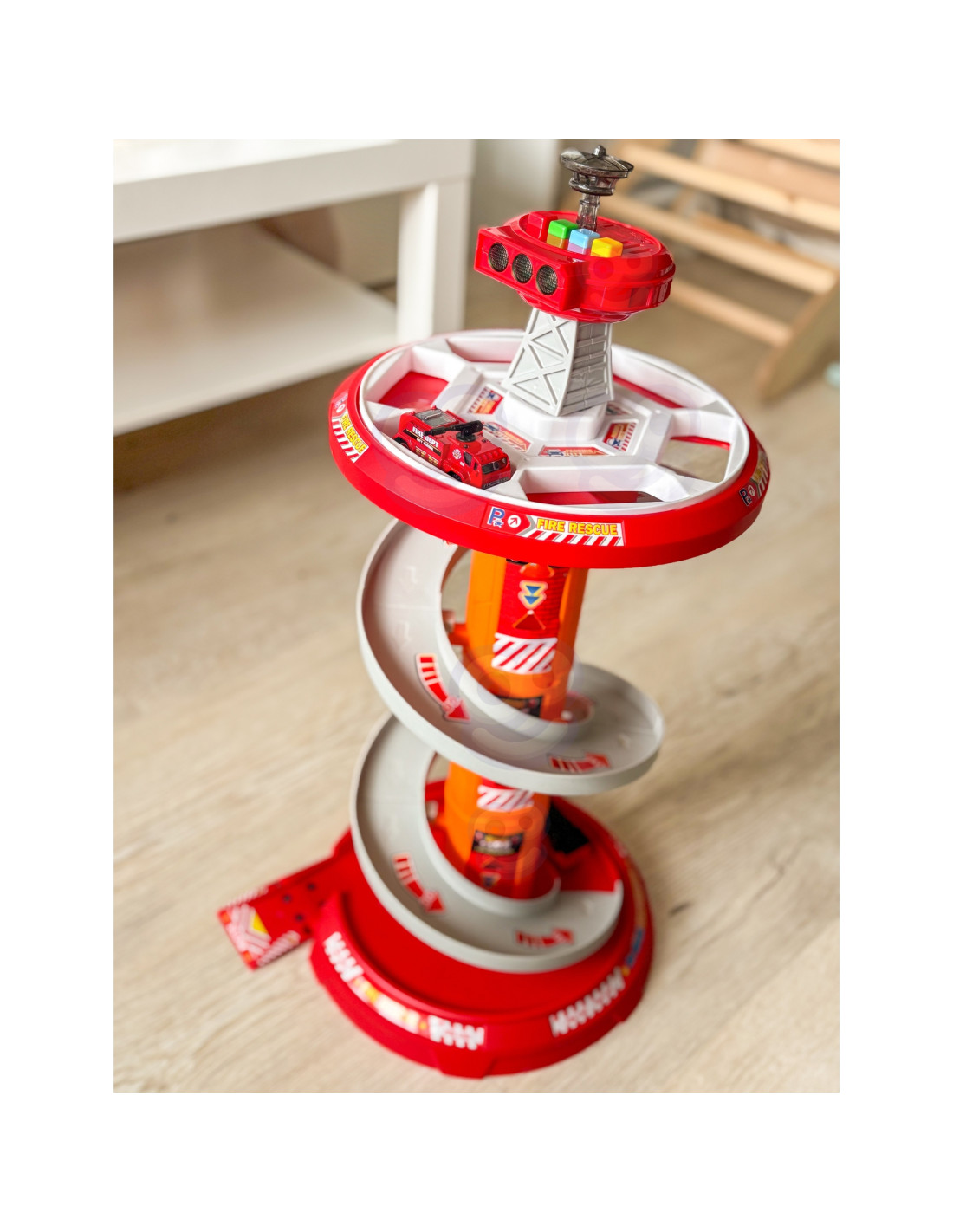 This fantastic multi-story rotating garage for the Fire Department from Woopie is sure to be a hit with any child. This toy will spark the imagination of any fire department fan, who, after leaving the parking lot, enters the included road . A special, winding descent allows for the cars to quickly descend from each level. The set also includes three different fire trucks .