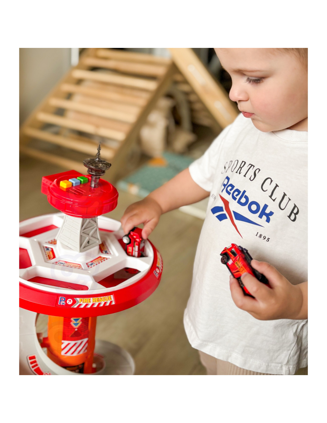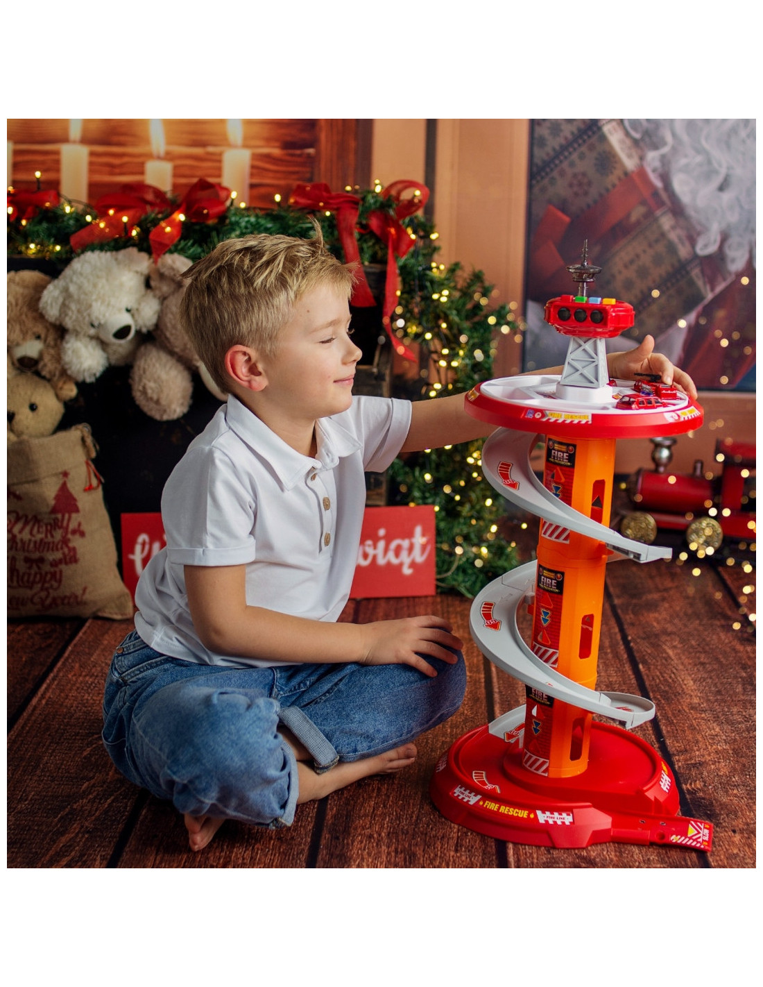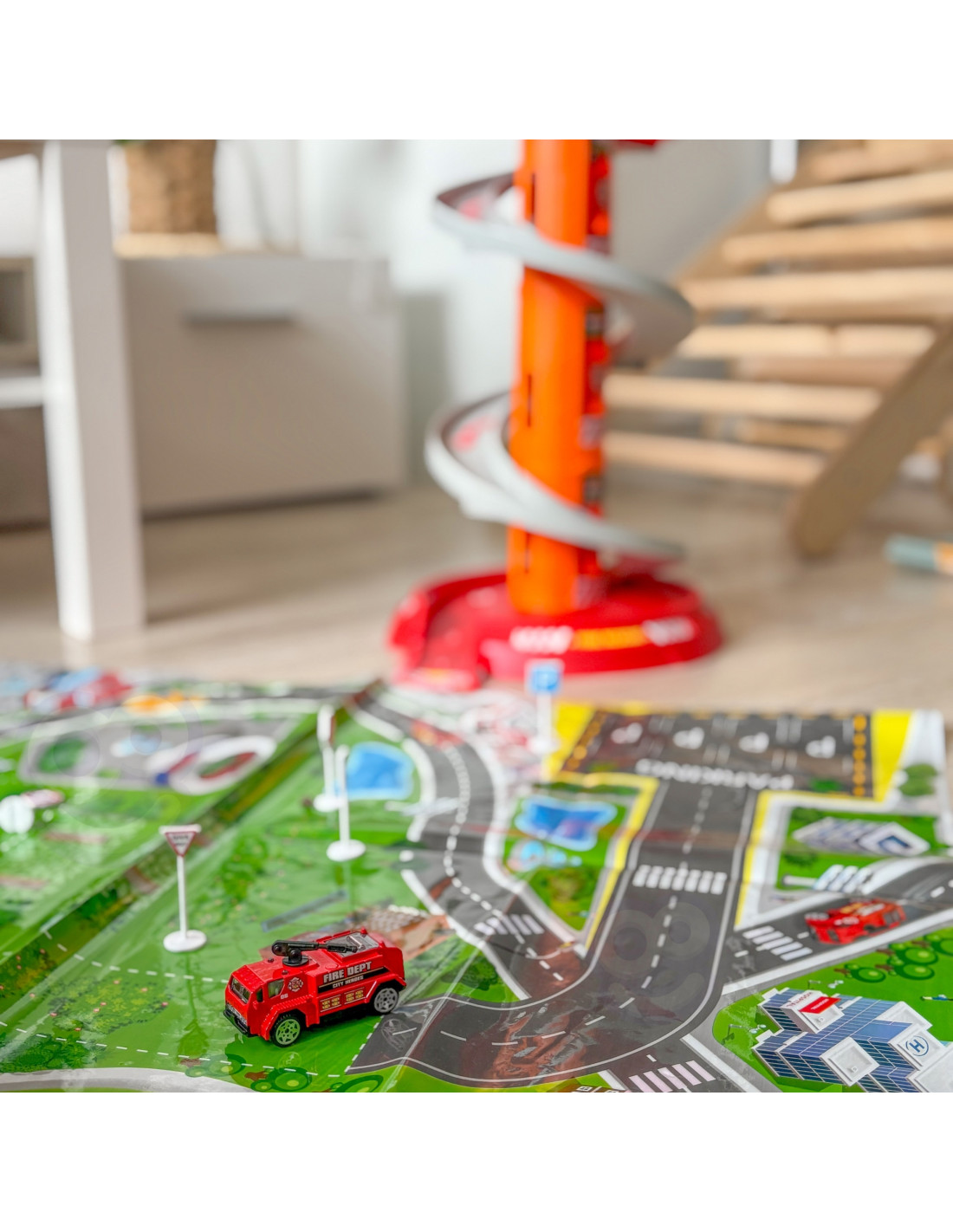 This fantastic multi-story rotating garage for the Fire Department from Woopie is sure to be a hit with any child. This toy will spark the imagination of any fire department fan, who, after leaving the parking lot, enters the included road . A special, winding descent allows for the cars to quickly descend from each level. The set also includes three different fire trucks .