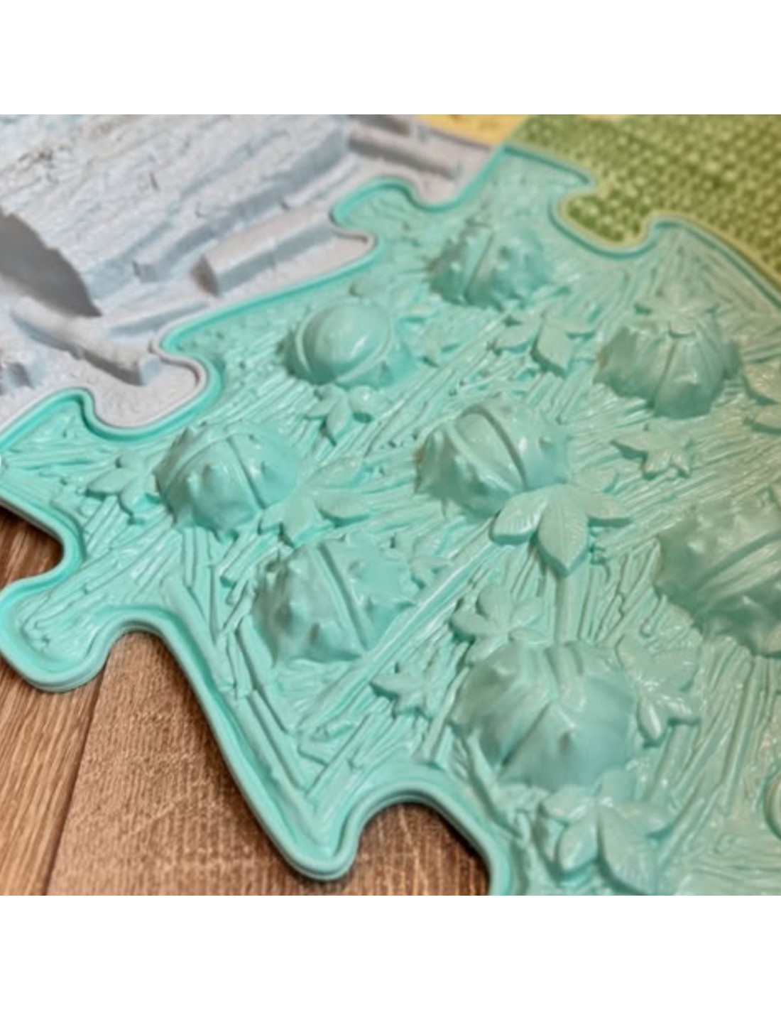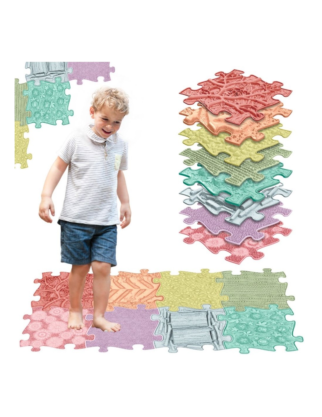 This set of sensory mats from Woopie is the perfect combination of movement , play , and everyday experiential learning . The varied textures stimulate children's feet, encouraging barefoot walking and active play. Pastel colors create a friendly space for exercise at home and at preschool. Each element is designed with healthy development and proper posture in mind. This is a product that children will love, and adults will appreciate for its real developmental support.