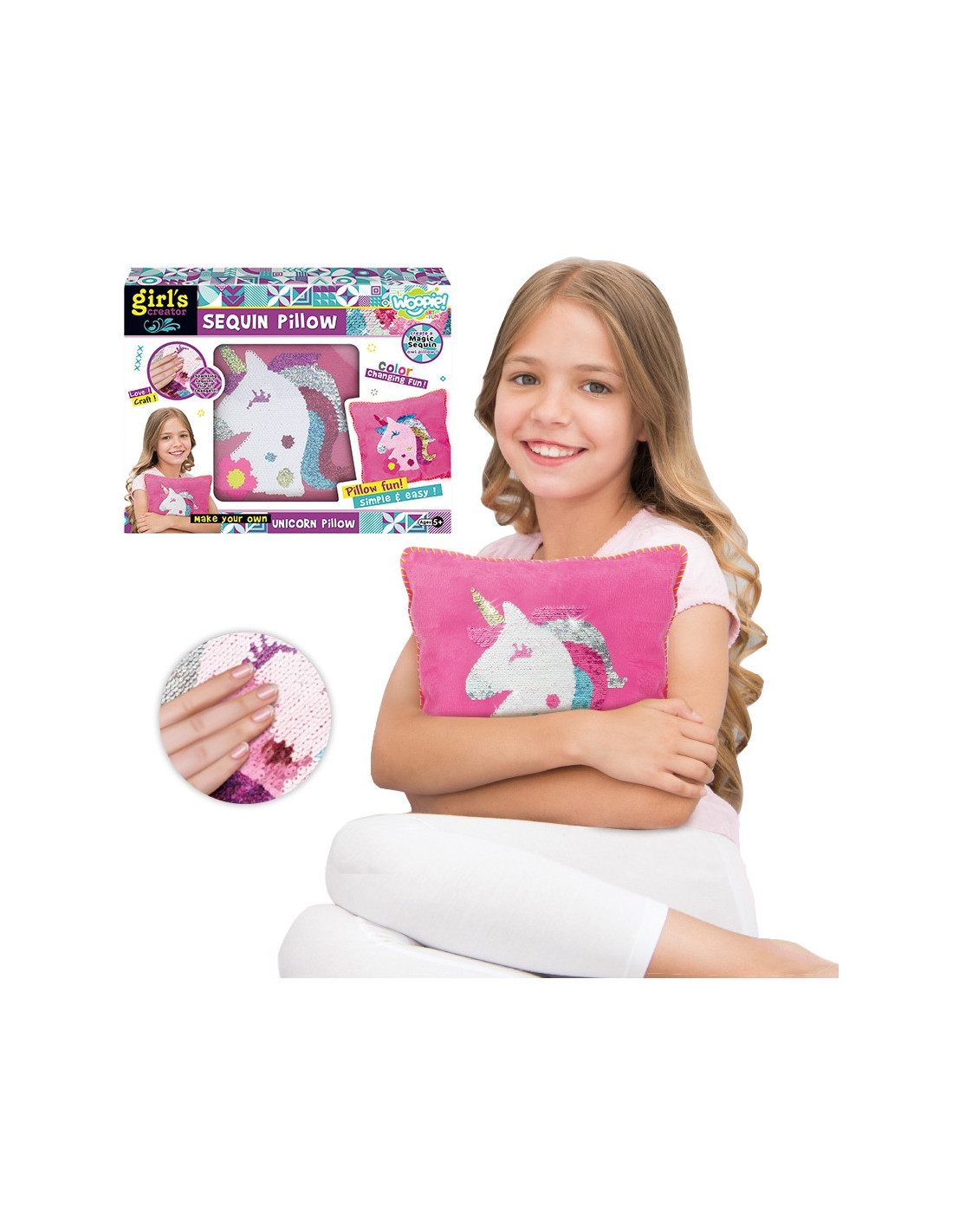 The WOOPIE Unicorn Decorative Pillow from the ART&FUN series will introduce your child to the world of fashion! A creative kit for everyone. The set includes : a pillowcase, a pillow, sequins, a needle, and nothing. Sewing the pillow is simple; anyone can do it – all it takes is a little imagination and creativity ! The finished pillow has a unique feature: it changes color when rubbed. The set develops early interests in sewing and fashion, patience , and above all, manual dexterity!
