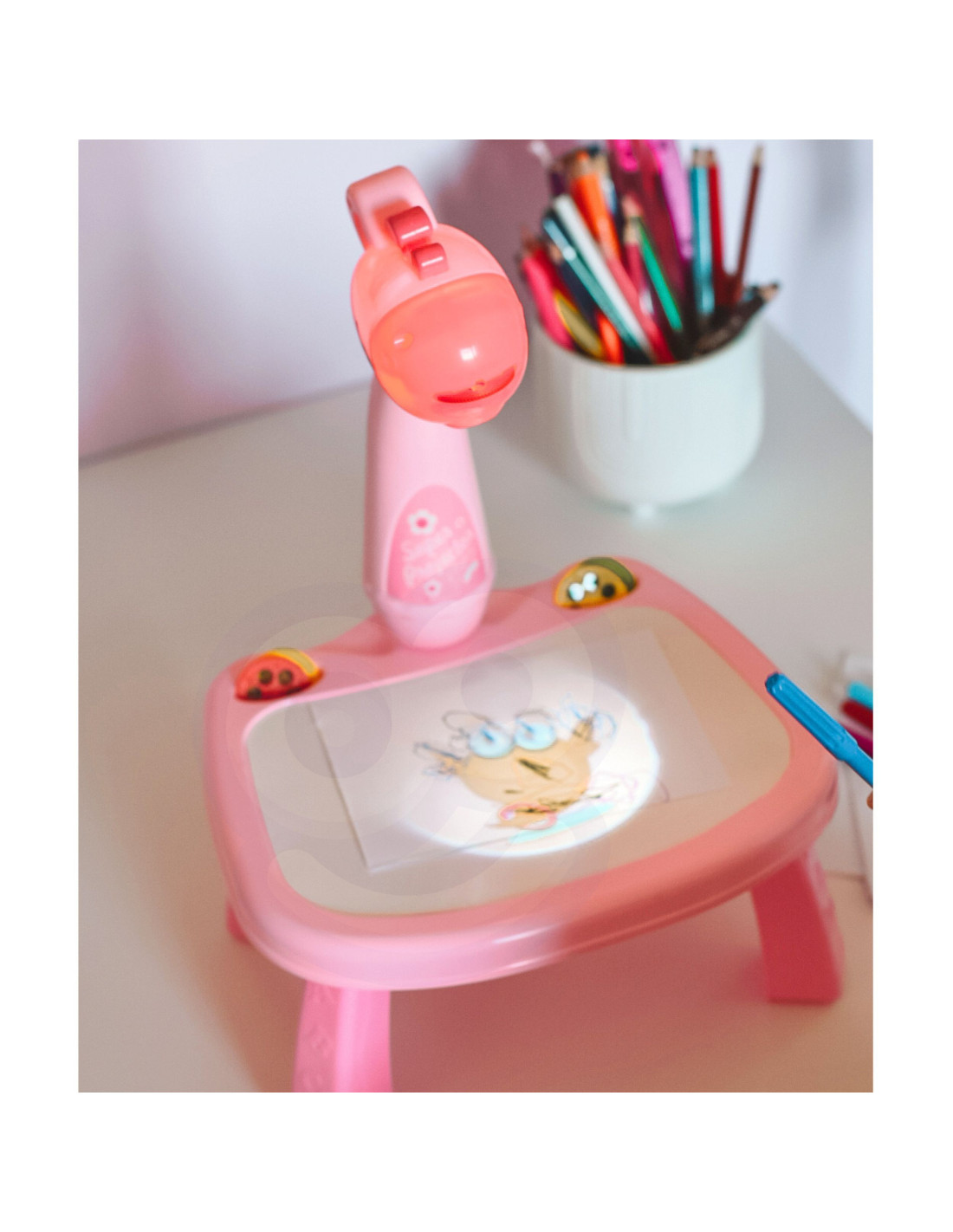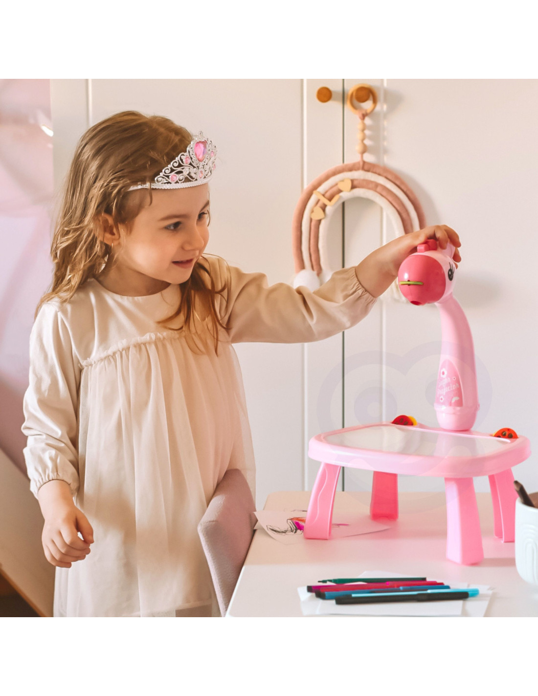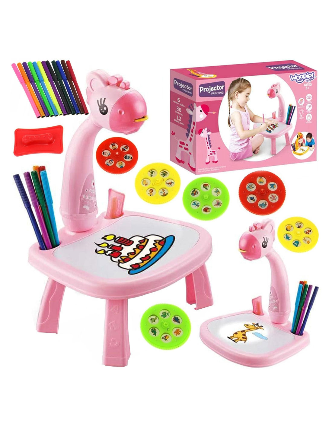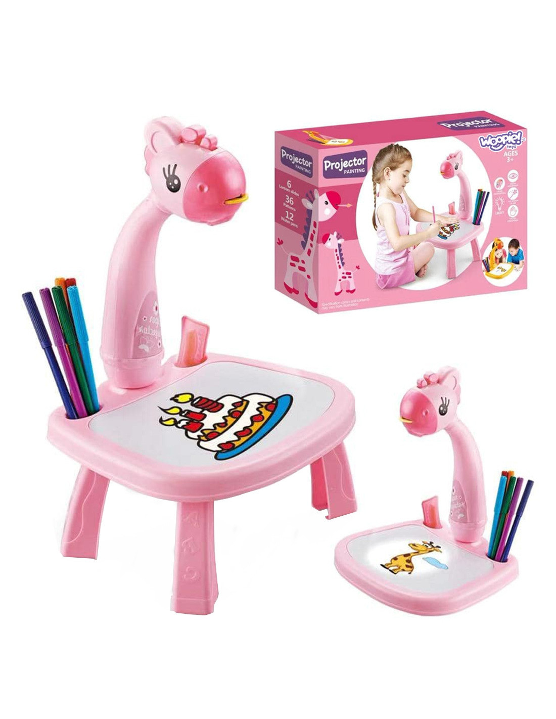 Spark your child's imagination with the adorable Woopie Drawing Projector! This colorful and interactive giraffe-shaped table features a projector and a built-in dry-erase board. The table displays colorful images, and children trace them on a piece of paper or a board. The lightweight design, fairy-tale look, and included markers and patterns make drawing a favorite activity for every child.