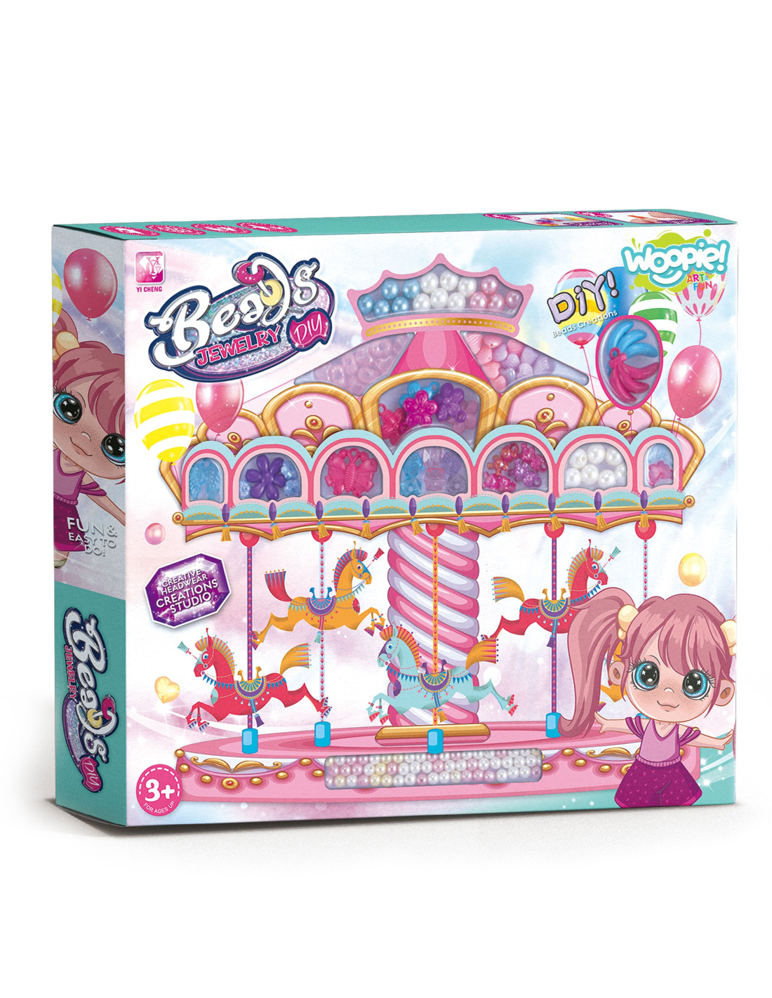 The Jewelry Making Kit from WOOPIE is a stylish, creative, and unique set for every child. Children can mix and match various beads and charms to create their own unique bracelet, ring, or pendant . The kit contains a variety of elements: beads of various sizes, charms , animal -like elements, and string . The set is packaged in a colorful carousel-themed box, making it perfect for a gift. Once unpacked, the kit is easy to carry – it's lightweight and handy, making it easy for children to take to preschool, to a friend's house, or to the garden. The packaging also features an organizer, allowing for safe storage of the small items included in the kit. Playing with jewelry-making positively impacts a child's development, shaping their artistic abilities along with developing their imagination and creativity , while also developing concentration ; it develops manual/motor skills, so-called fine motor skills. "fine motor skills" (hand movements) , and when playing with friends, it teaches cooperation , sharing and improves social and integration skills.