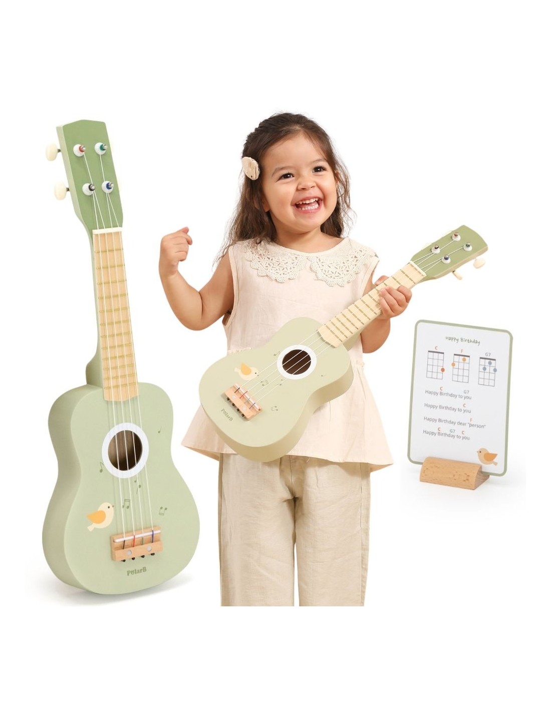 Discover your child's musical talent with our charming wooden ukulele! This unique toy is not only fun but also develops hearing, rhythm, and coordination. Thanks to the four strings, little ones can create their first melodies, and the included sheet music for "Happy Birthday" will get them started on their musical journey right away!