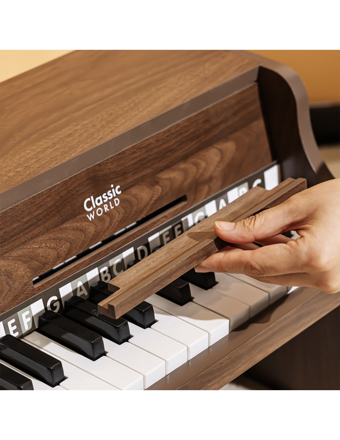 The Classic World Wooden Piano is an elegant educational toy that introduces children to the world of music in an accessible and engaging way. With its aesthetic walnut-like finish and compact size, it's perfect both as a learning instrument and as a decorative element in a child's room.