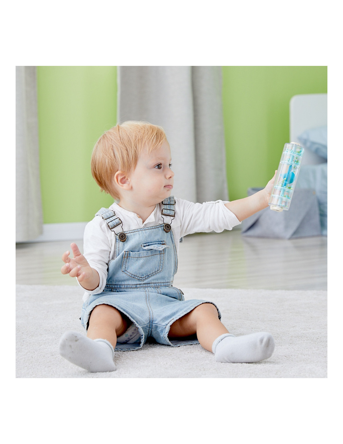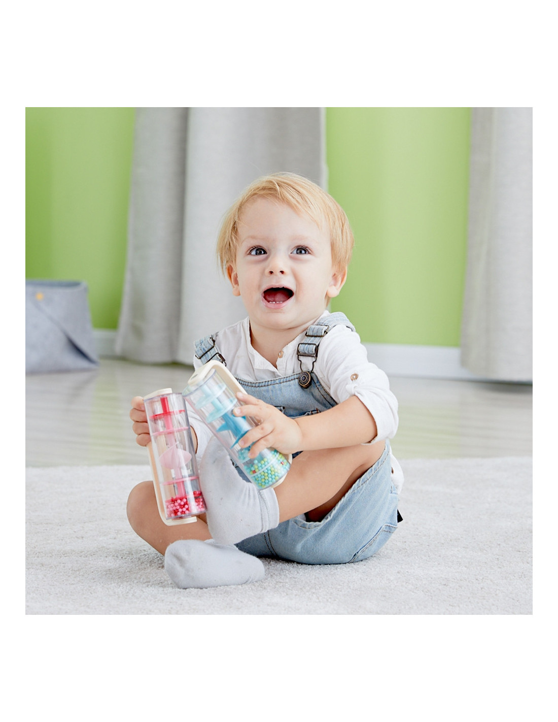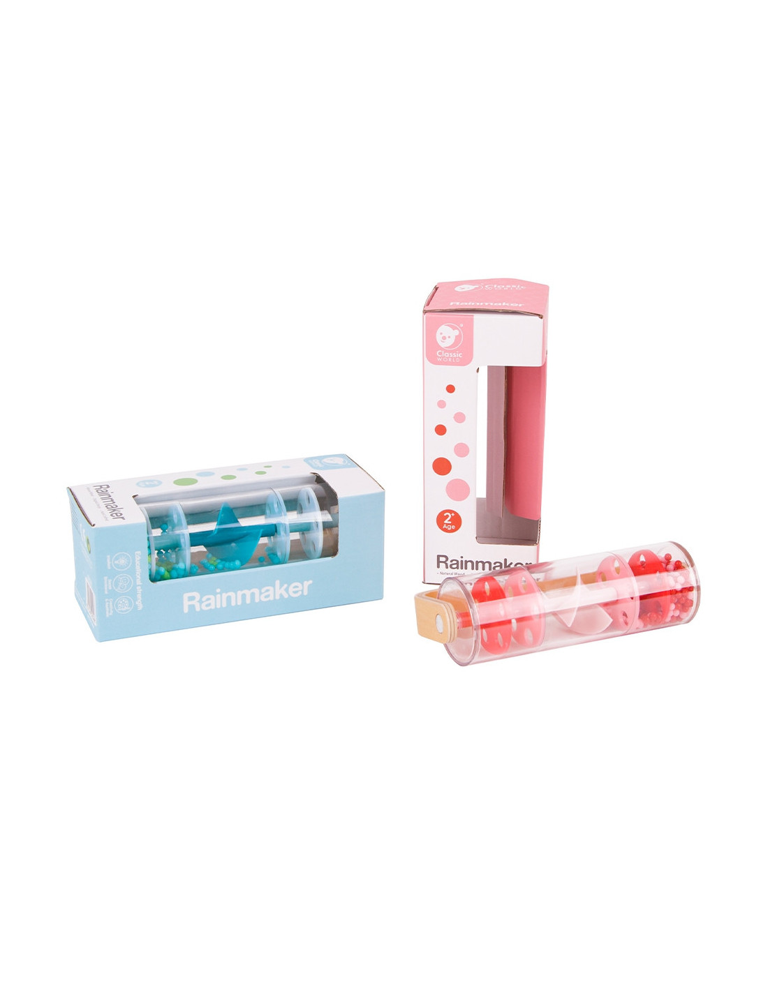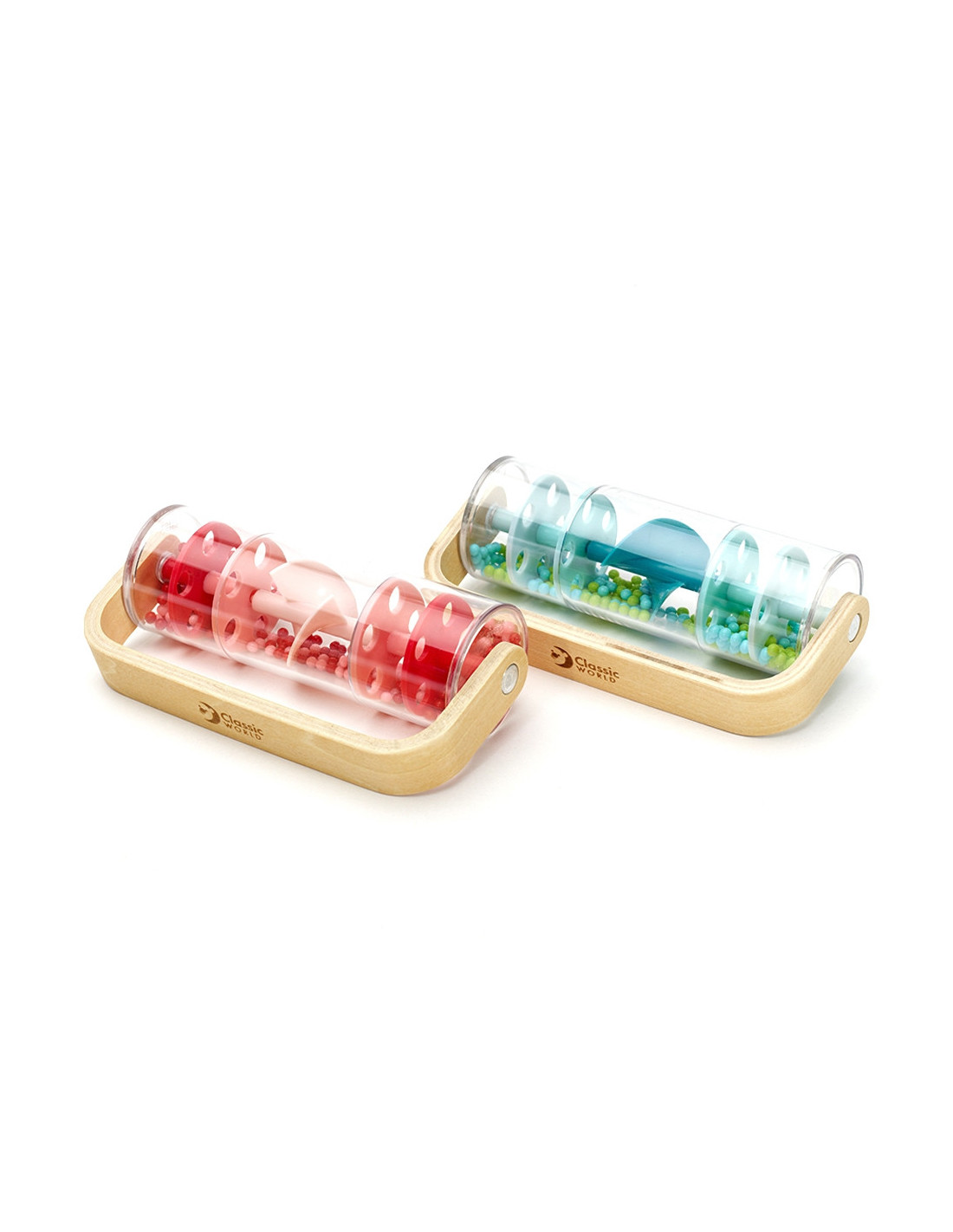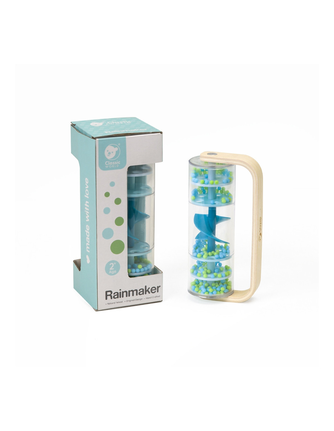 Wooden and Plastic Blue Rain Shower with Balls by CLASSIC WORLD with falling balls that create the soothing sound of falling rain. Shake, twist, and turn, and watch the beads tumble from top to bottom. With one quick twist, you can transform this toy into a rattle that spins 360 degrees. Great for sensory development. A perfect prop for rhythmic gymnastics classes!